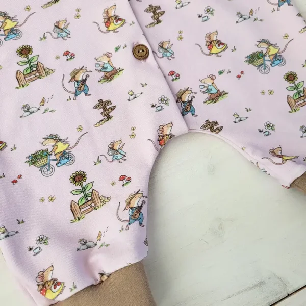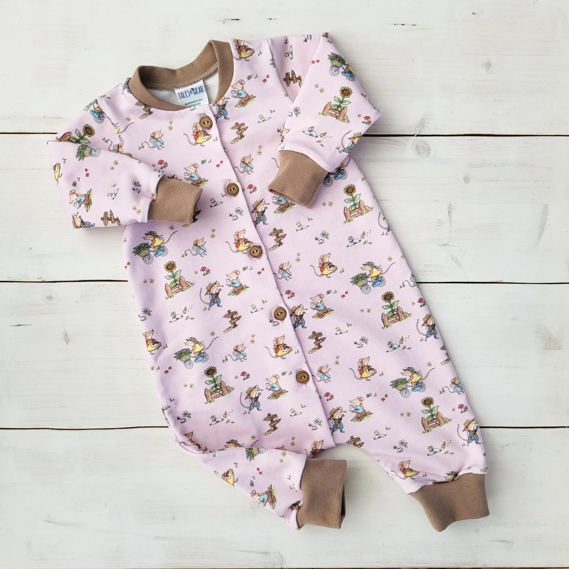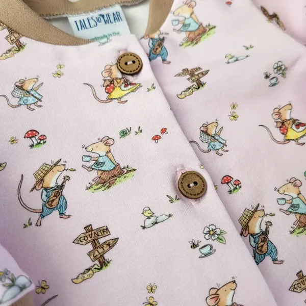 Handmade organic cotton jersey pink baby overall featuring The Country Mouse and The City Mouse.