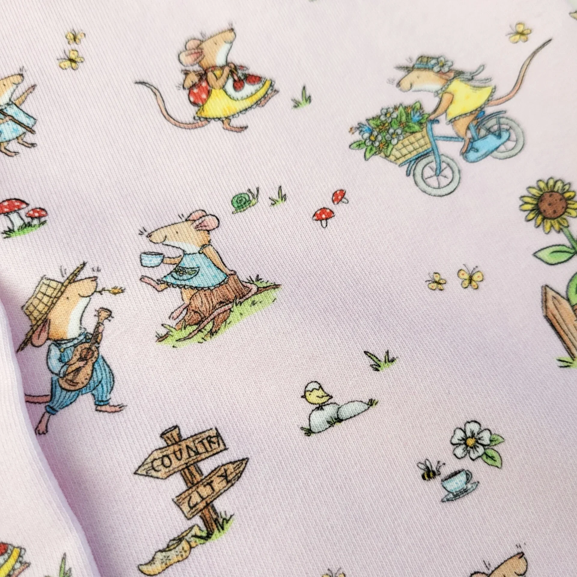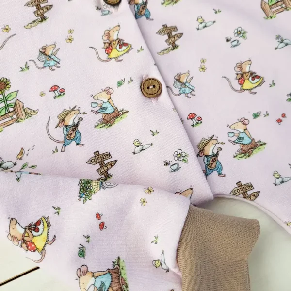 PINK with brown cuffs: This Dutch-themed pattern features female mice only: there's Mrs Mouse riding her bike on a bright Spring day with a basket full of fresh flowers, Mother Mouse walking with a insanely cute baby on her back and a little girl chasing butterflies with her net. Where do you think they're headed to? The country or the city? Can you spot all those adorable tiny clogs? The cuffs and neck band are made from a nice contrasting dark beige/brown organic ribbed jersey (a stretchier material that ensures a good fit and elasticity).