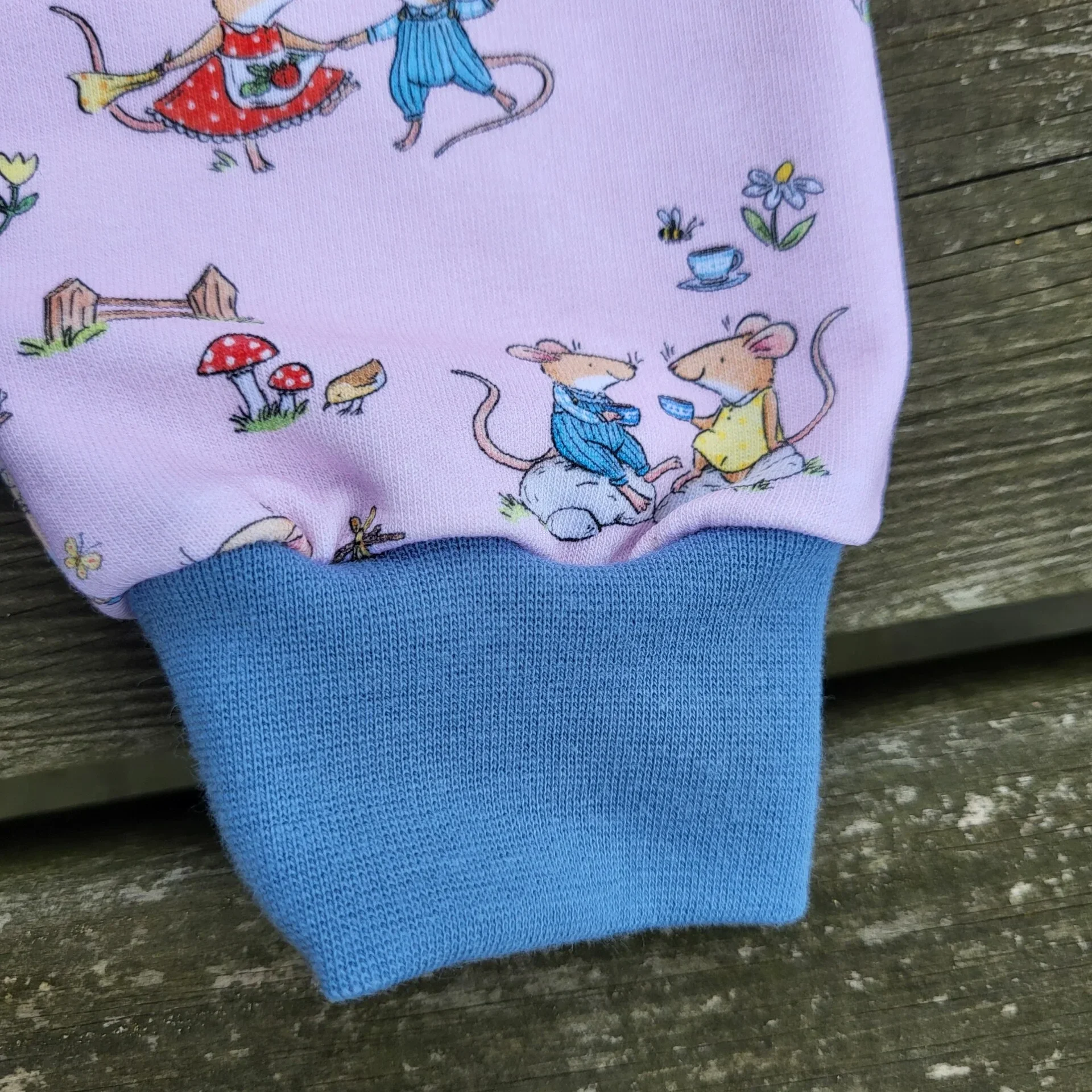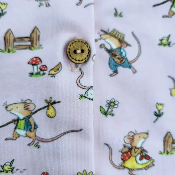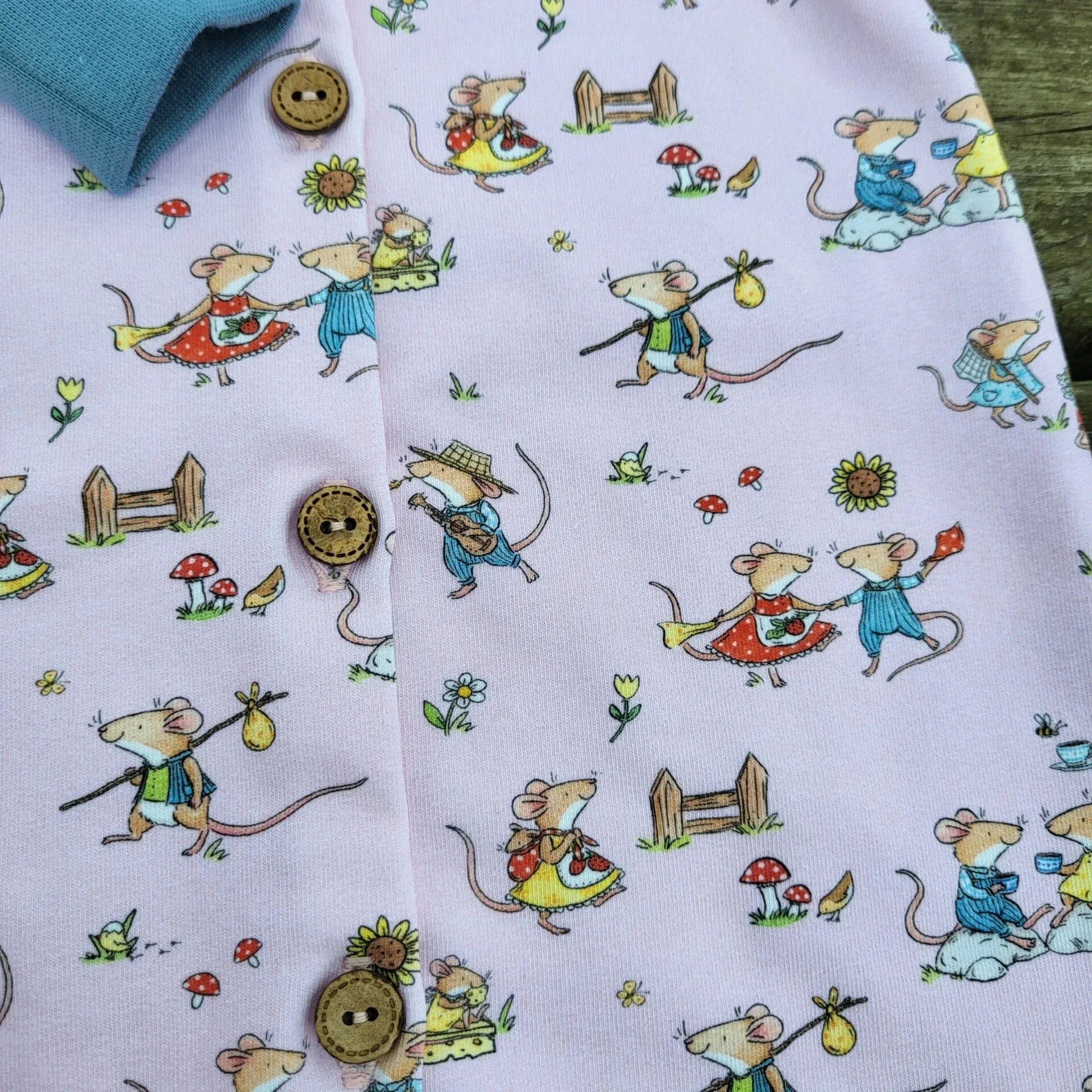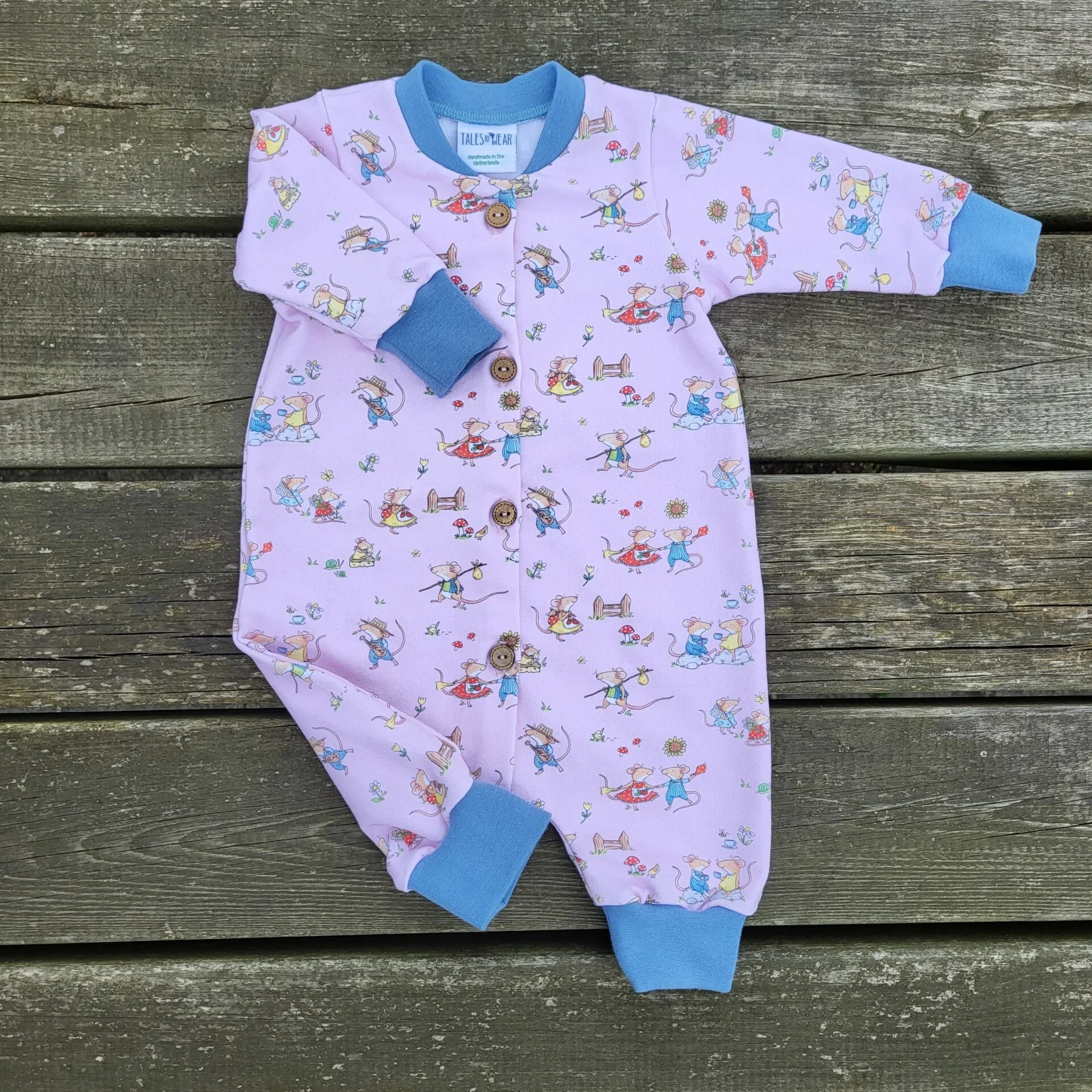 Handmade organic cotton jersey baby pink overall featuring The Country Mouse and The City mouse.