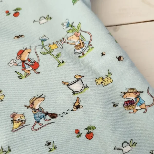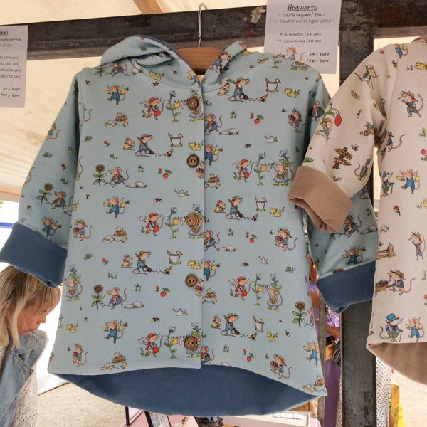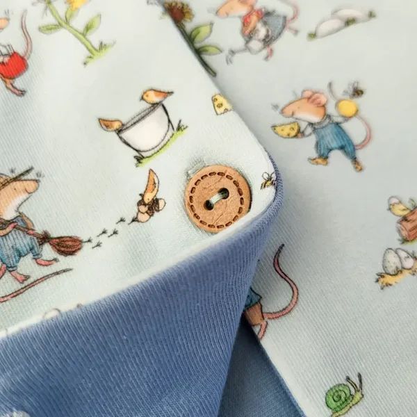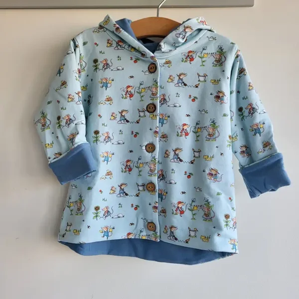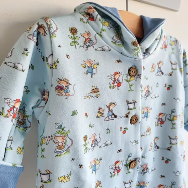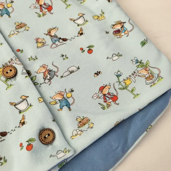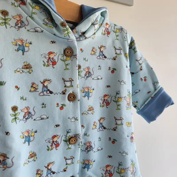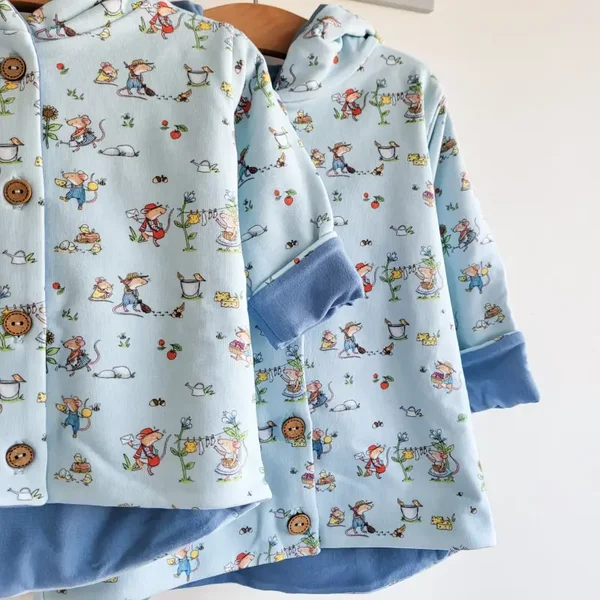 Handmade baby/children light blue jacket from organic cotton jersey featuring the mice from The Country Mouse and The City Mouse collection.