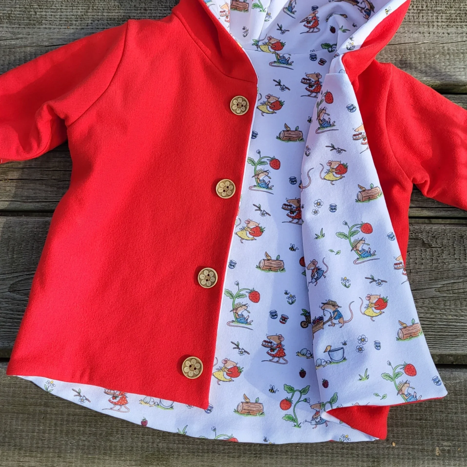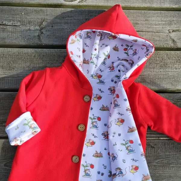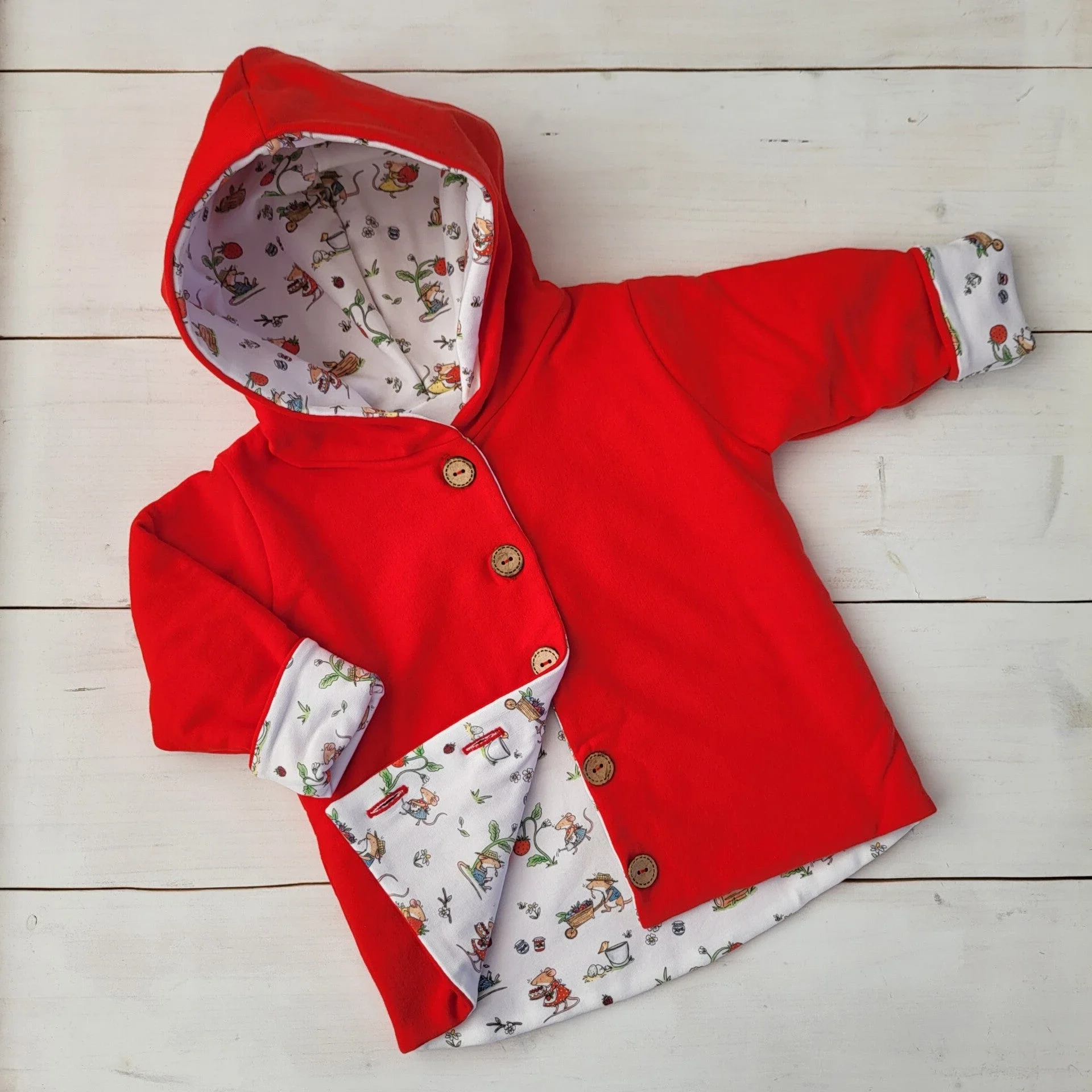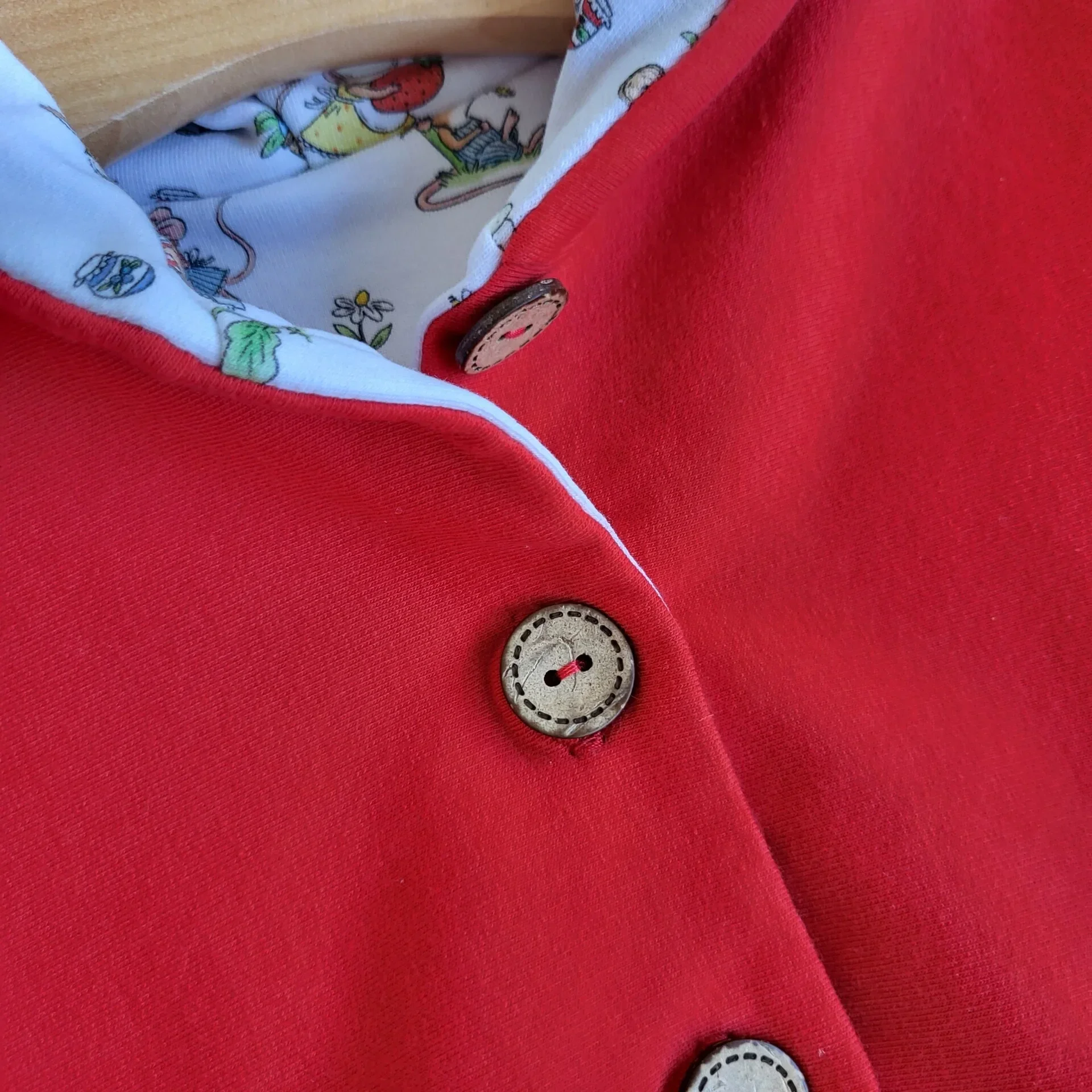 Soft, warm and roomy are the three words which better describe the qualities of this lovely organic HOGWARTS hooded jacket. Ooops! Did I mention irresistibly cute?! The red jackets are a real eye-catcher with their ovely patterned lining. Let's start from its softness, though. What makes it so fluffy? A combination of two fabrics: a red brushed French Terry outside (warm sweater fabric) and a loopback cotton jersey for the lining. What makes it so fluffy? The red fabric works its magic with its brushed side hidden between the seams. What makes it warm? The fact that the red fabric is made from an organic warm sweater material called French Terry, with a brushed yet not visible side and the outside is a slightly thicker organic cotton jersey. What makes it roomy? Because it's designed to have a generous fit, it can be used either as a longer buttoned cardigan as well as a lighter jacket (not water proof, of course), depending on the outside temperature and on what the child is wearing underneath.