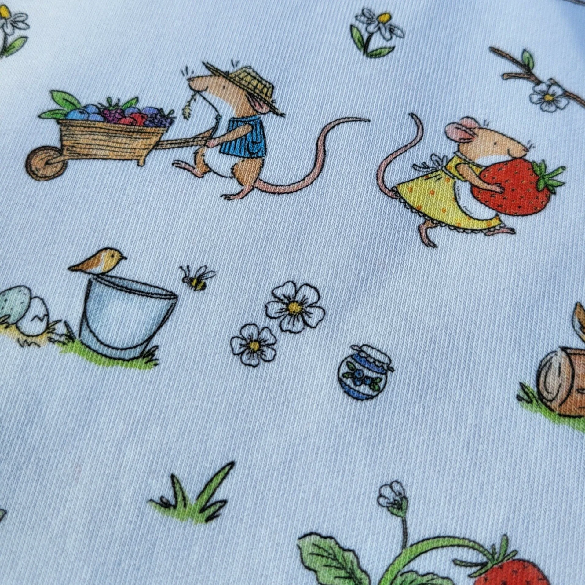 Handmade baby/children light blue jacket from organic cotton jersey featuring the mice from The Country Mouse and The City Mouse collection.