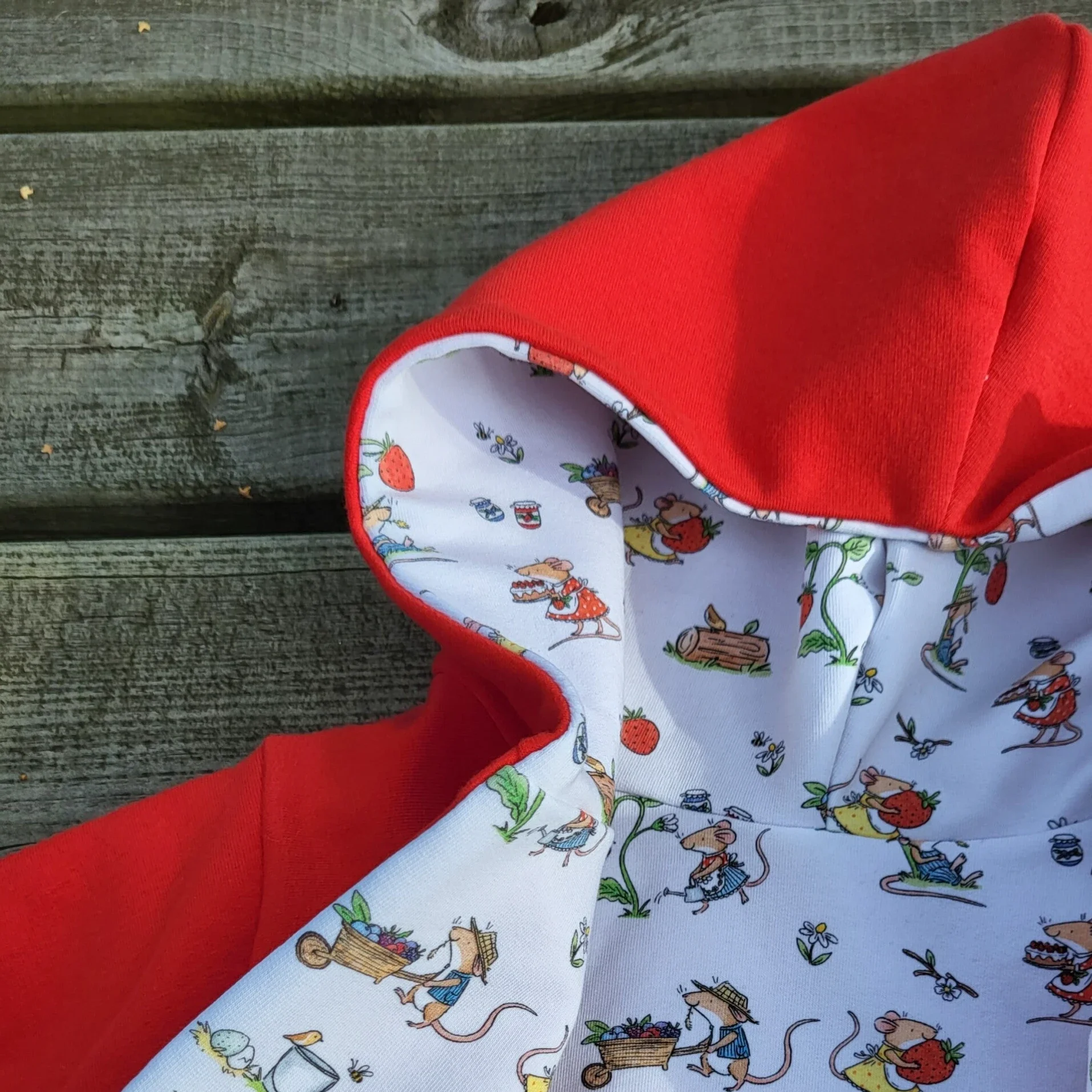 The red jacket is the only one featuring an even colored outer fabric and a patterned lining. The "Strawberries Party" mice pattern on the lining shows male characters as well as female characters and is scattered with sweet and juicy strawberries on a white or light cream background (depending on availability).