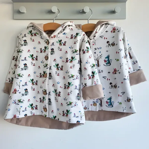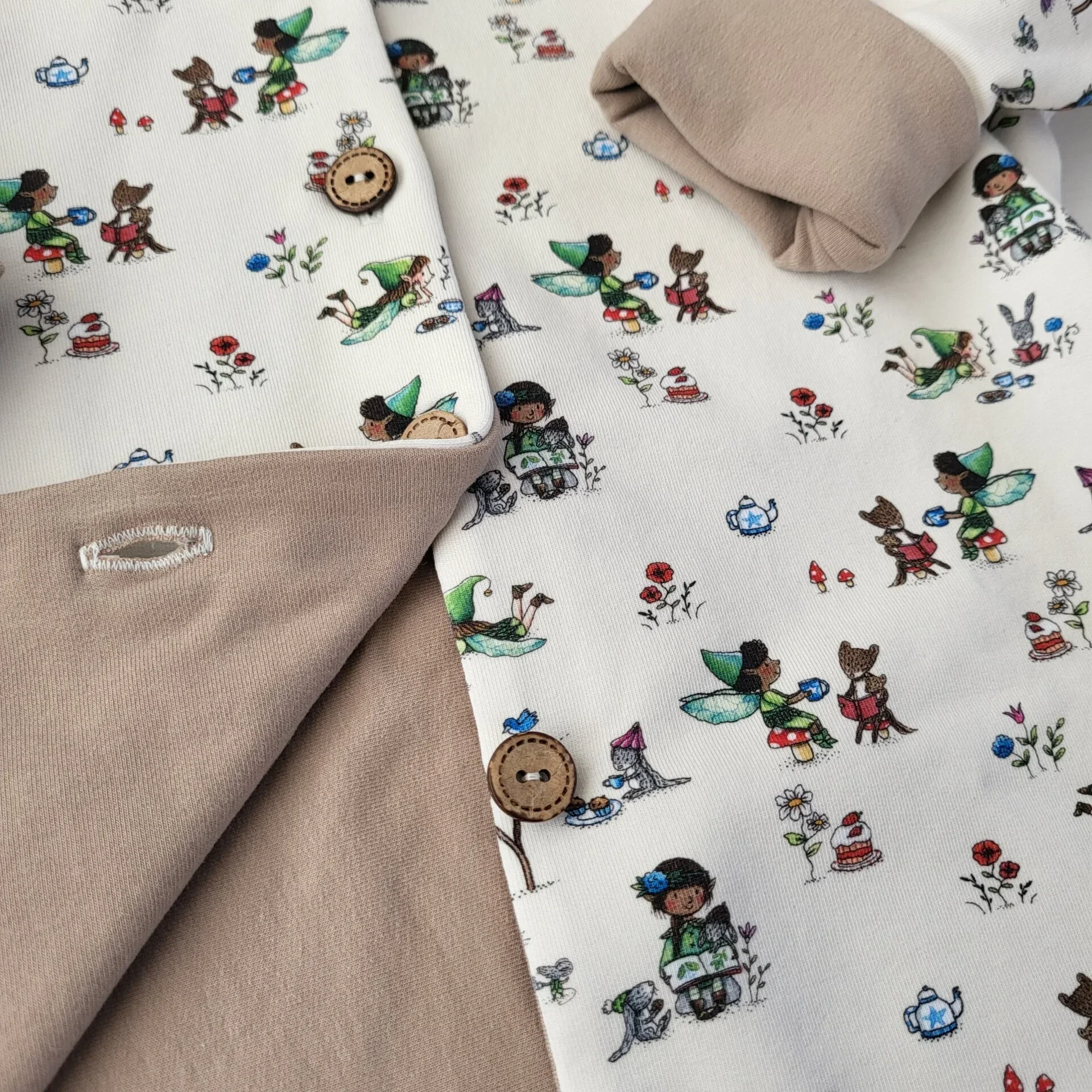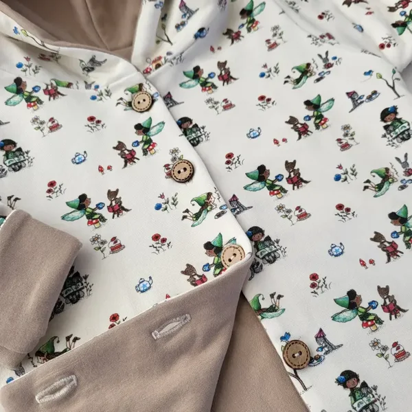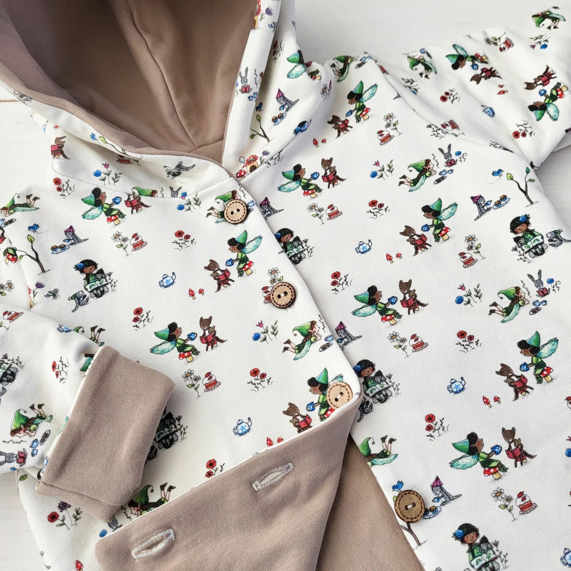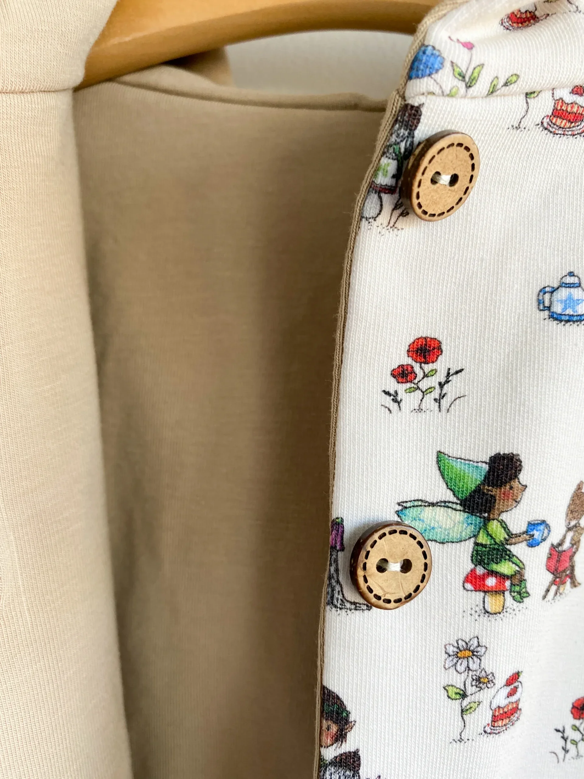 Handmade baby/children's light hooded neutral/cream jacket from organic cotton jersey featuring the fairies from The Magical Tea Time Collection.
