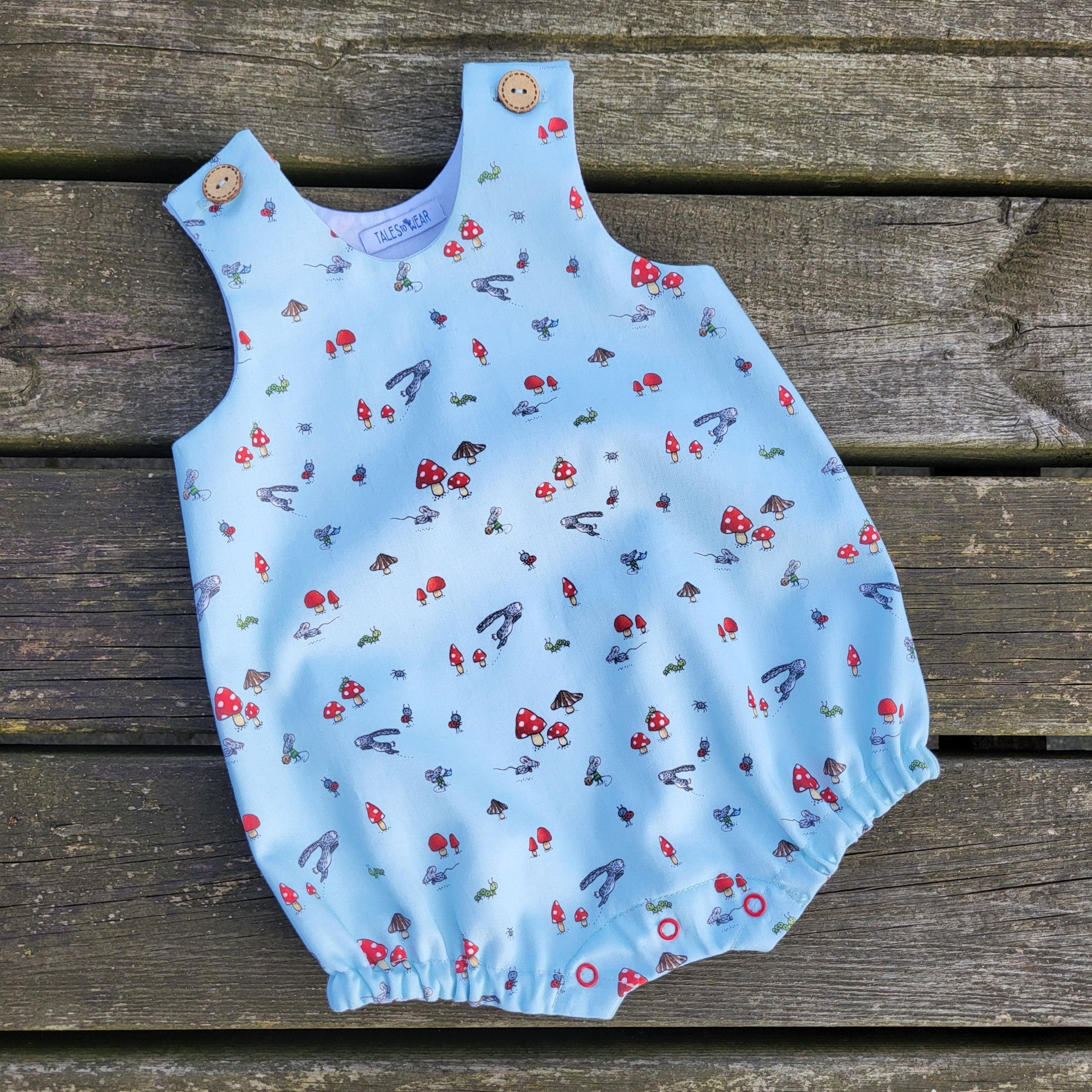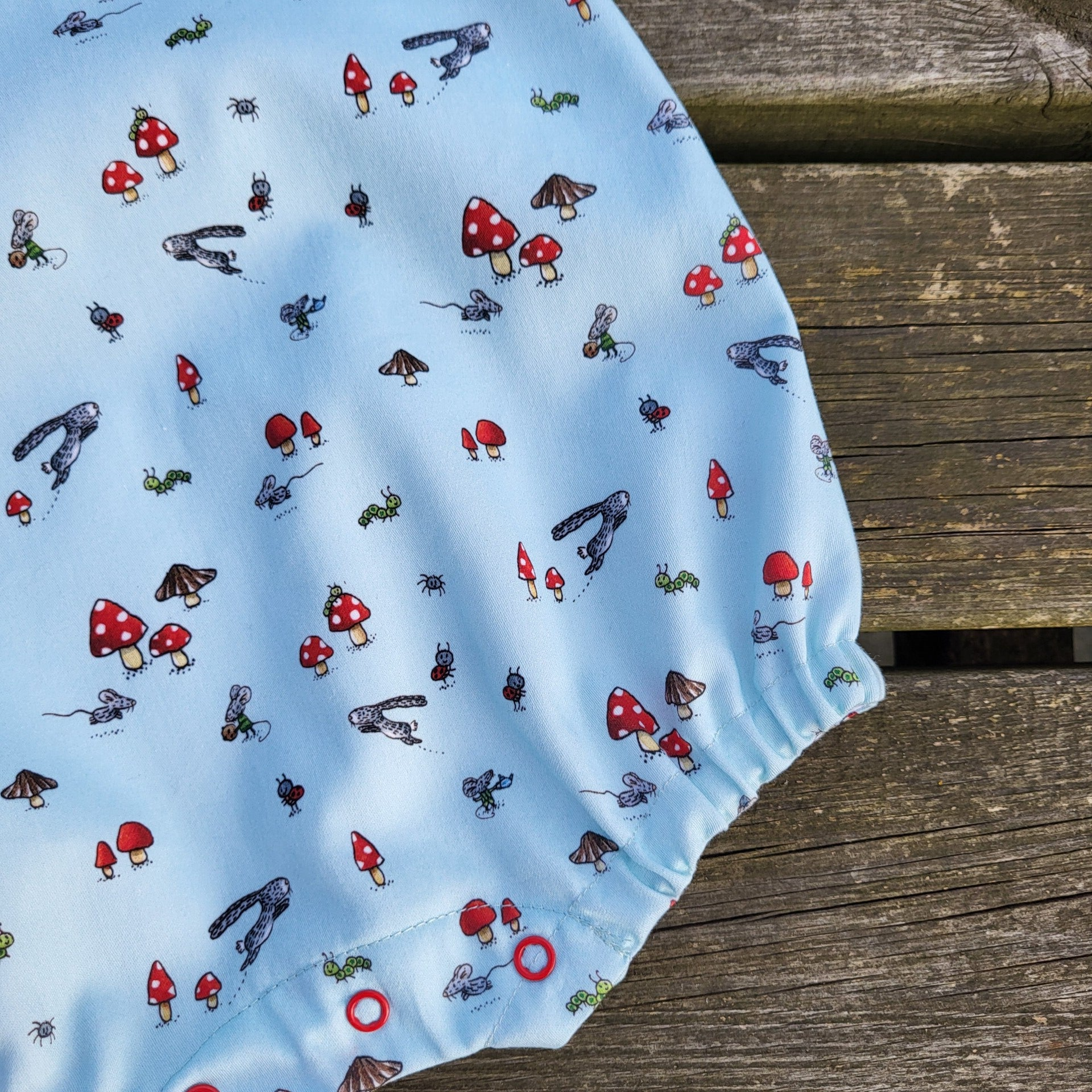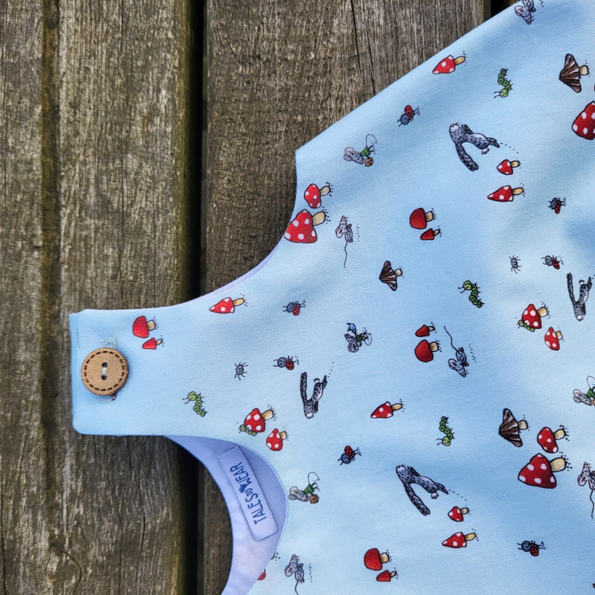 Handmade light blue Spring/ Summer romper in woven cotton, with open crotch, featuring little mushrooms, bunnies and mice from the Magical Tea Time collection.
