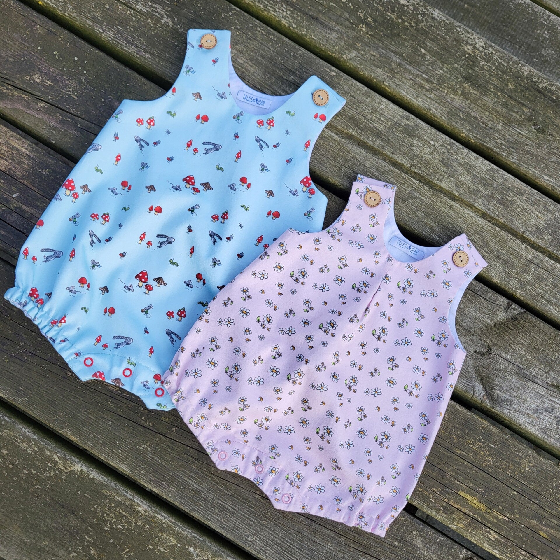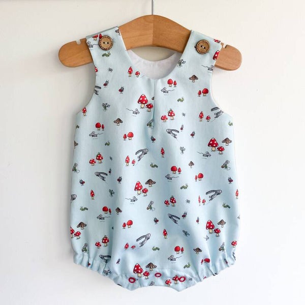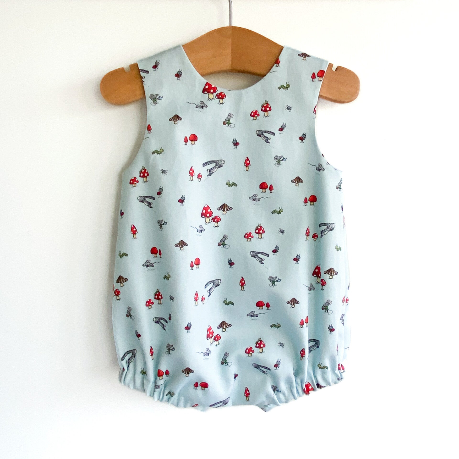 Handmade light blue Spring/ Summer romper in woven cotton, with open crotch, featuring little mushrooms, bunnies and mice from the Magical Tea Time collection.