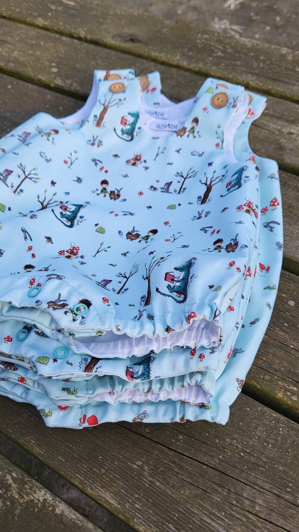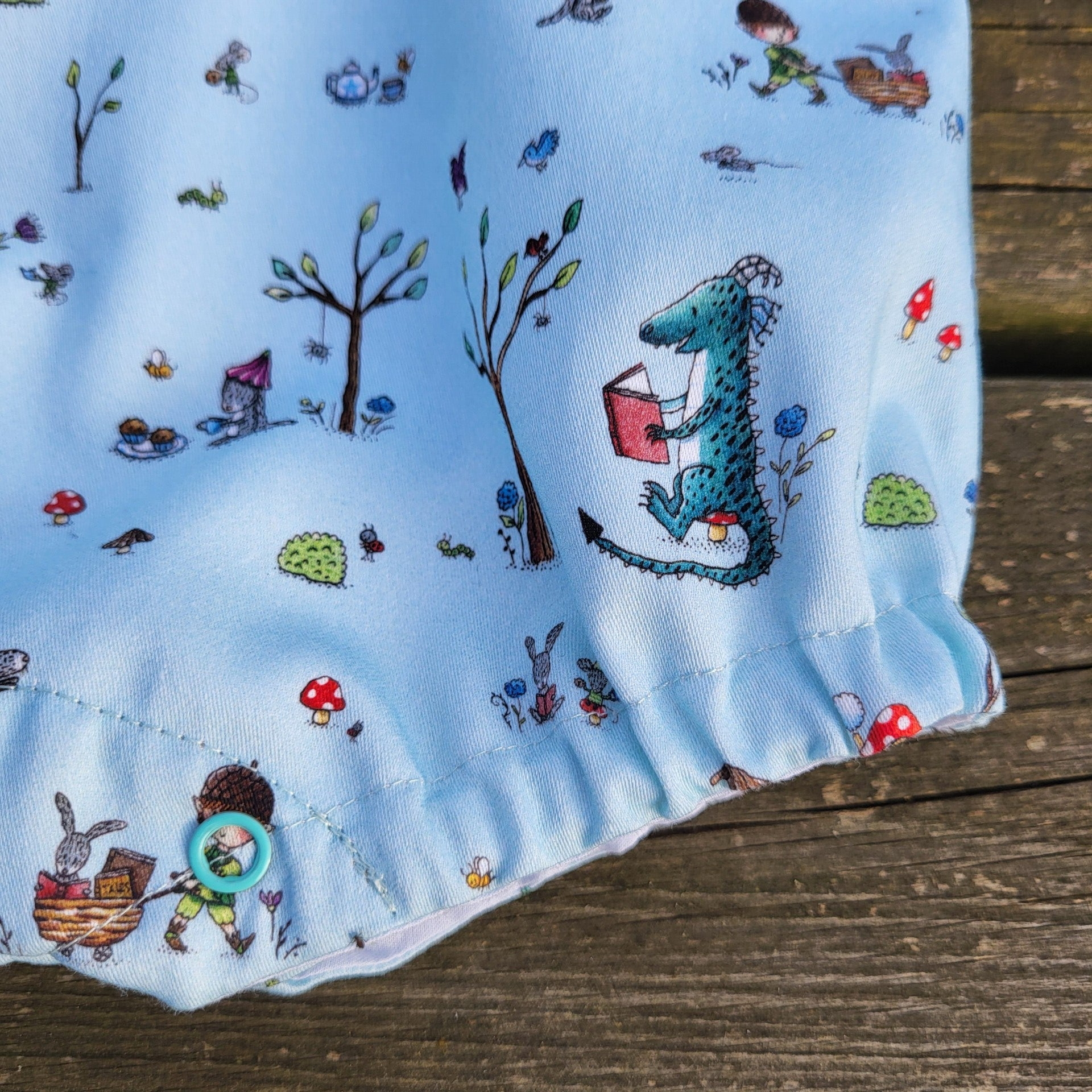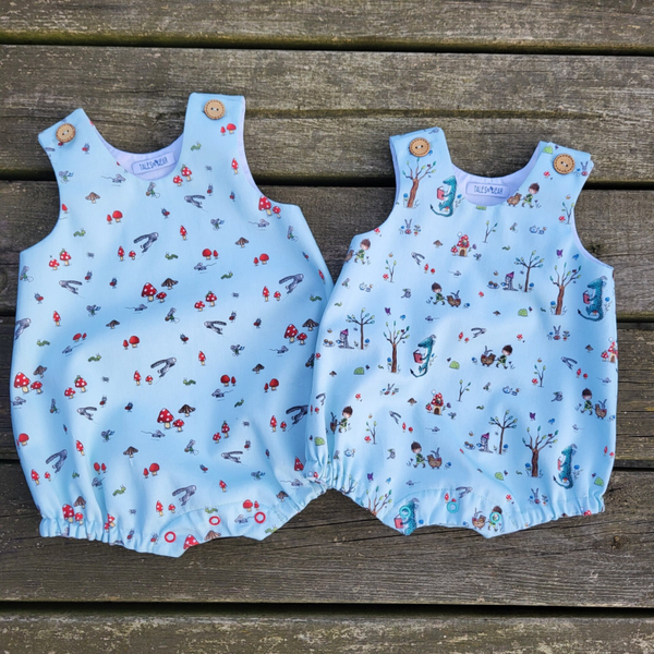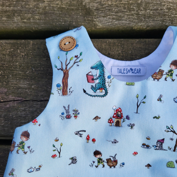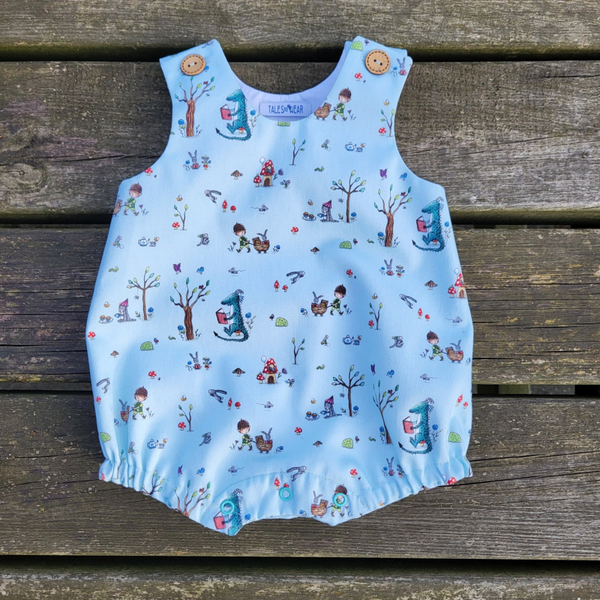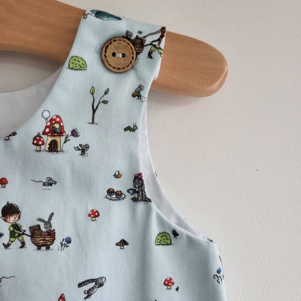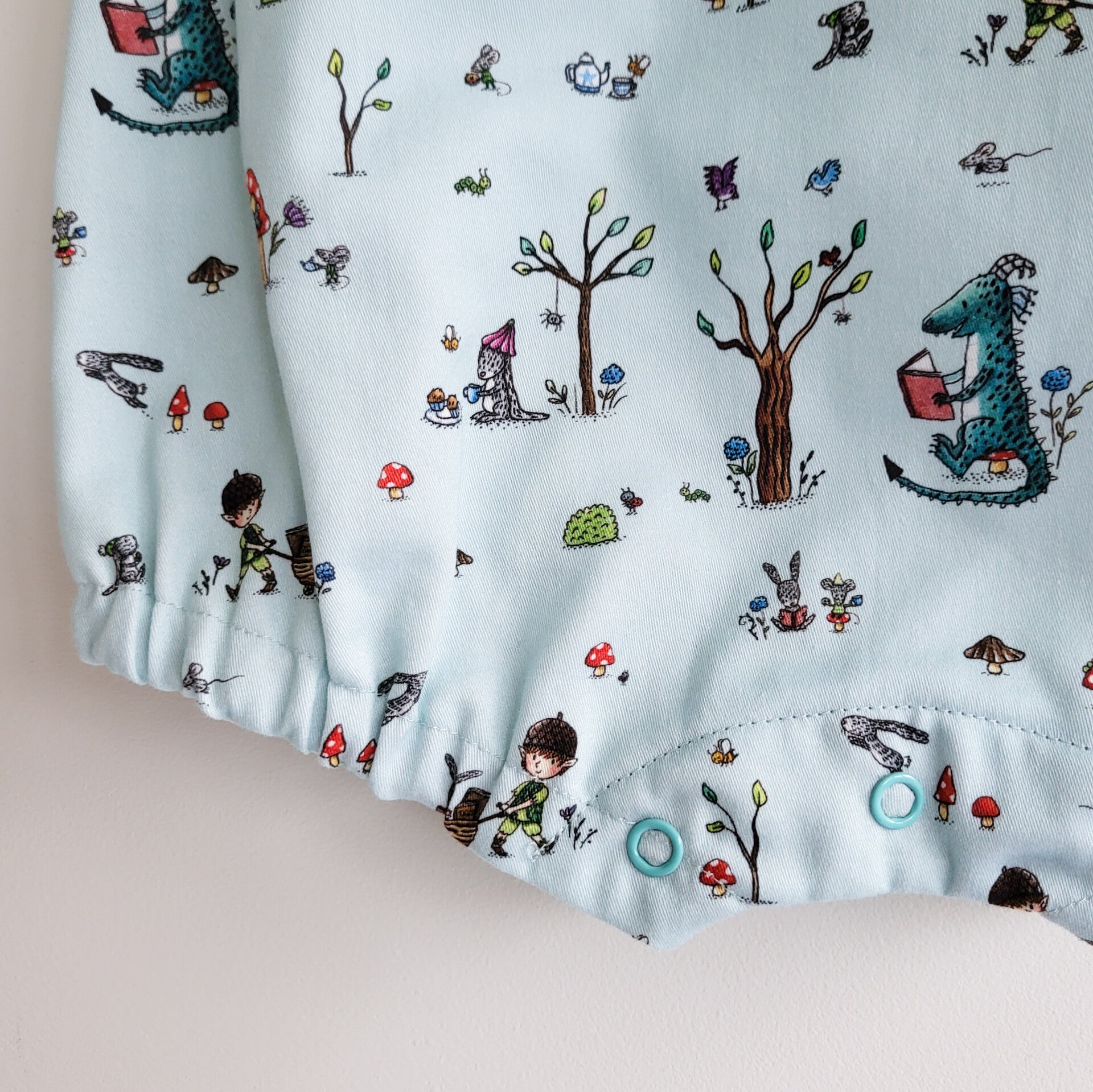 Handmade light blue Spring/ Summer romper in woven cotton, with open crotch, featuring little mushrooms, bunnies and mice from the Magical Tea Time collection.