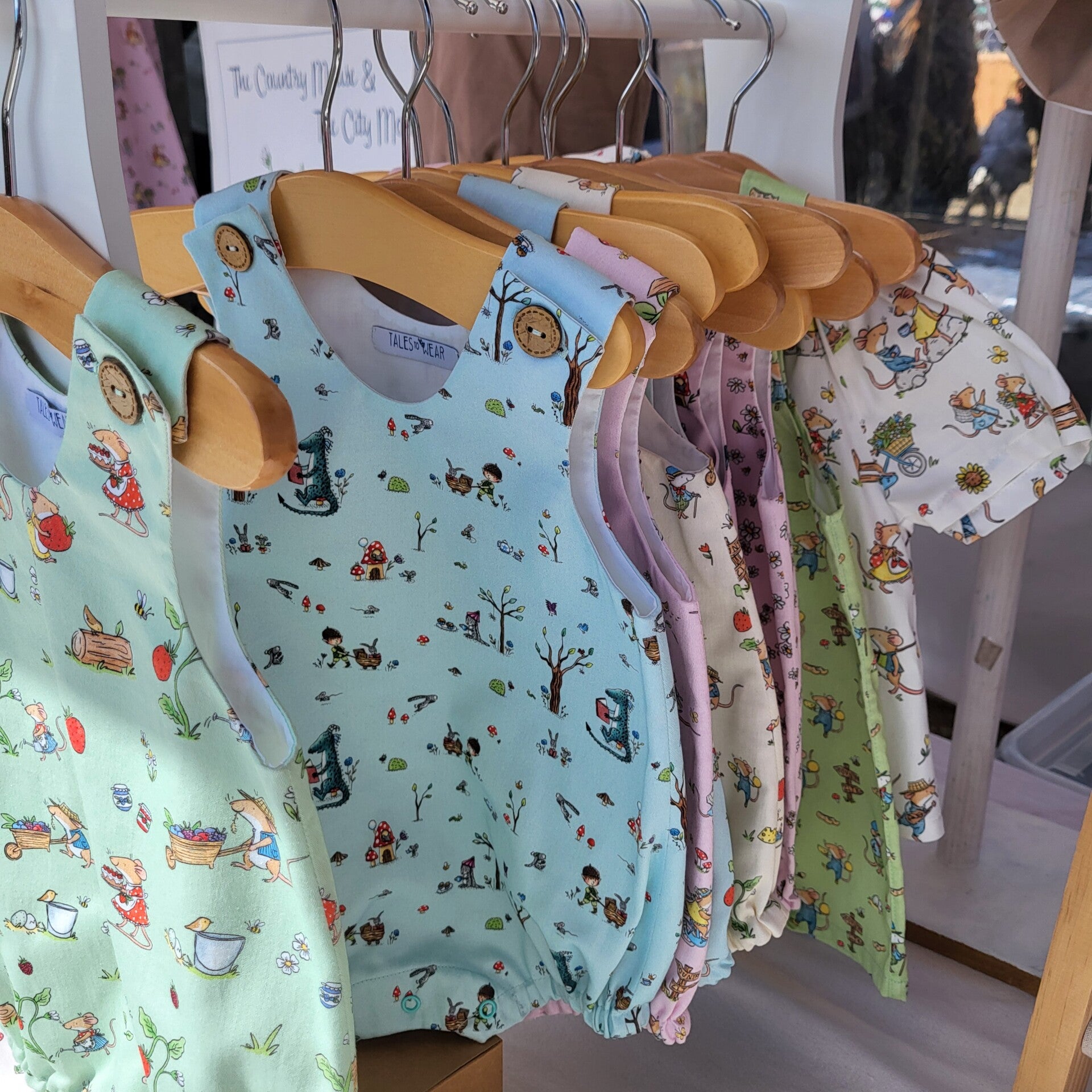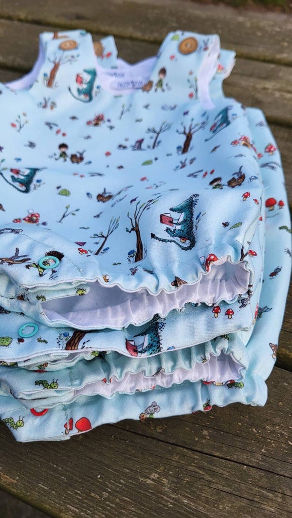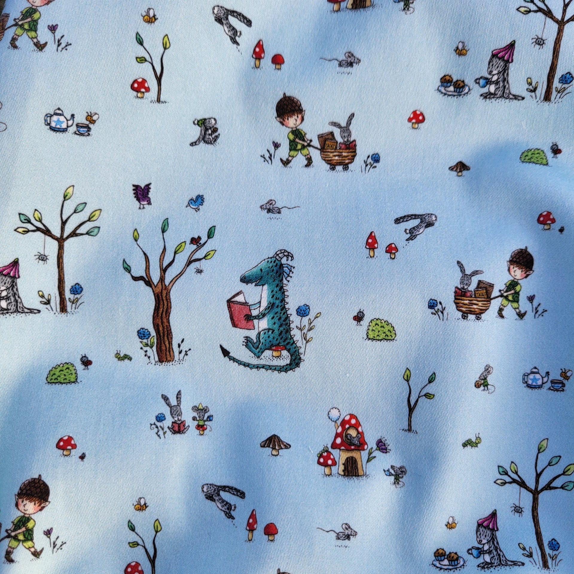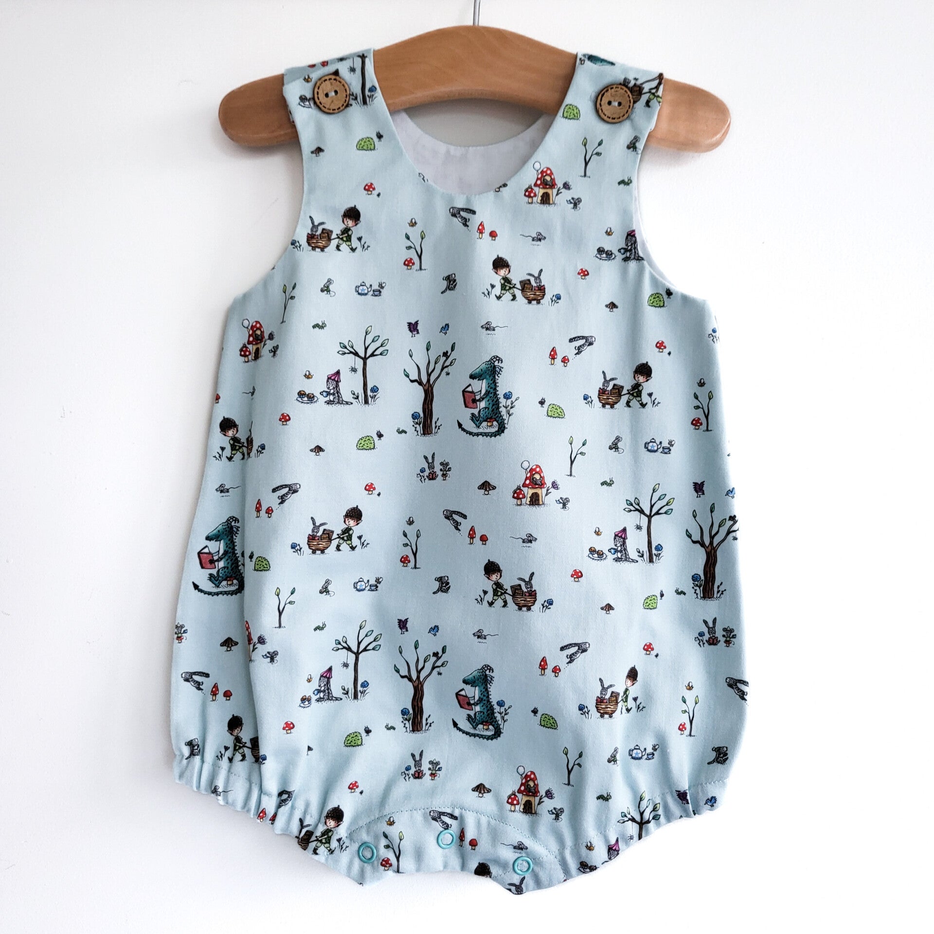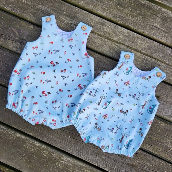 Handmade light blue Spring/ Summer romper in woven cotton, with open crotch, featuring little mushrooms, bunnies and mice from the Magical Tea Time collection.