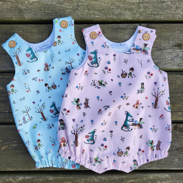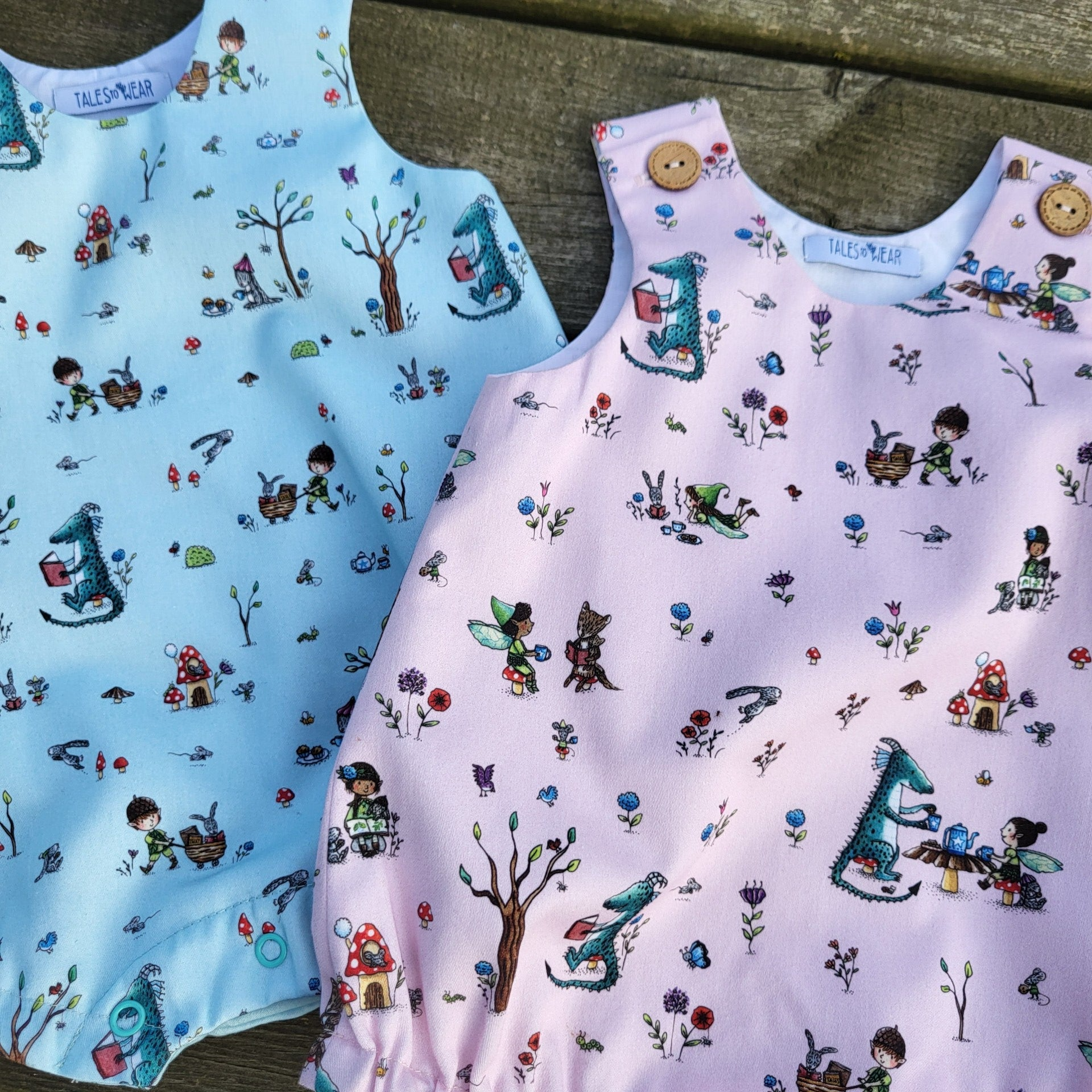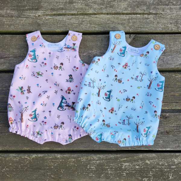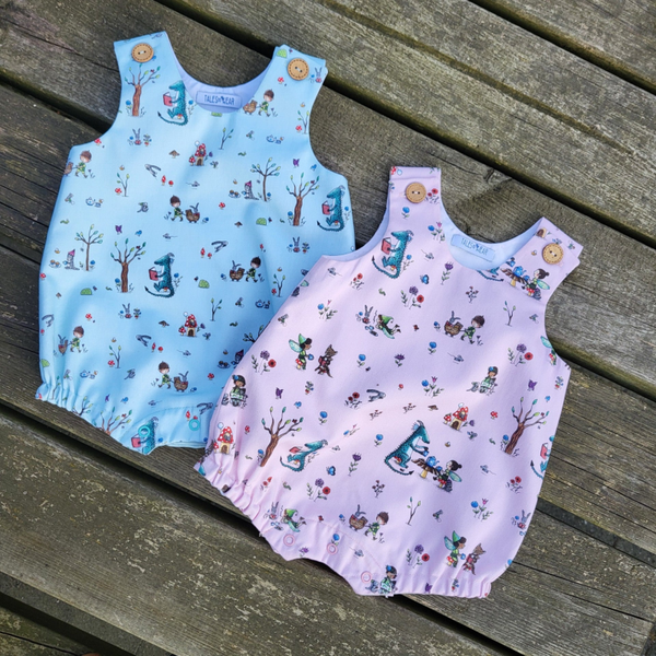 This cute bubble romper model is called ASLAN and you can choose between two colors, either pink or blue. The pink one features the complete pattern created by Rosalinde Bonnet, while the blue one only features male characters. Of course you'll find our not-so-scary-dragon in both of them, but if you prefer a romper without the fairies in it, then you should opt for the blue one.