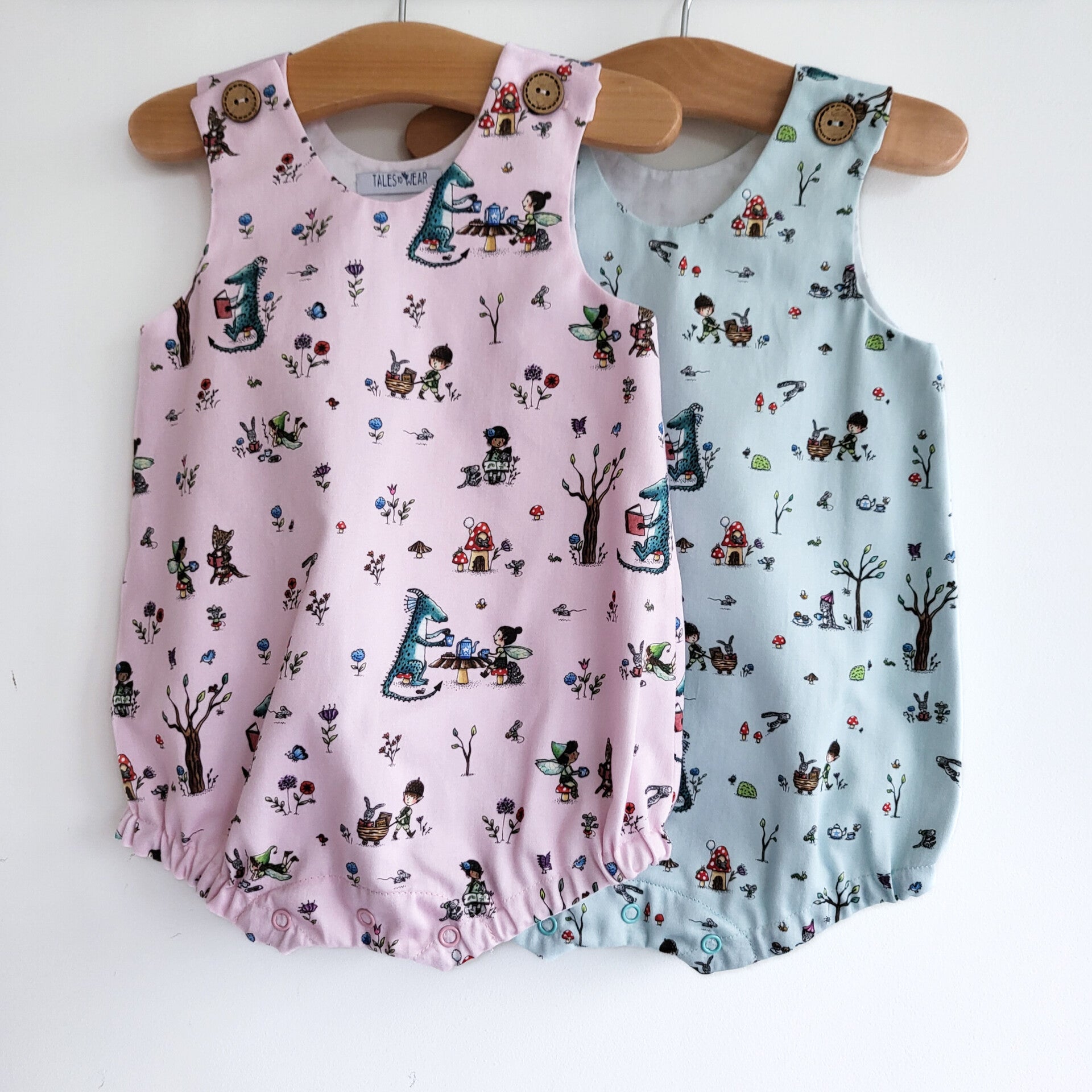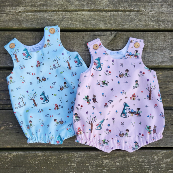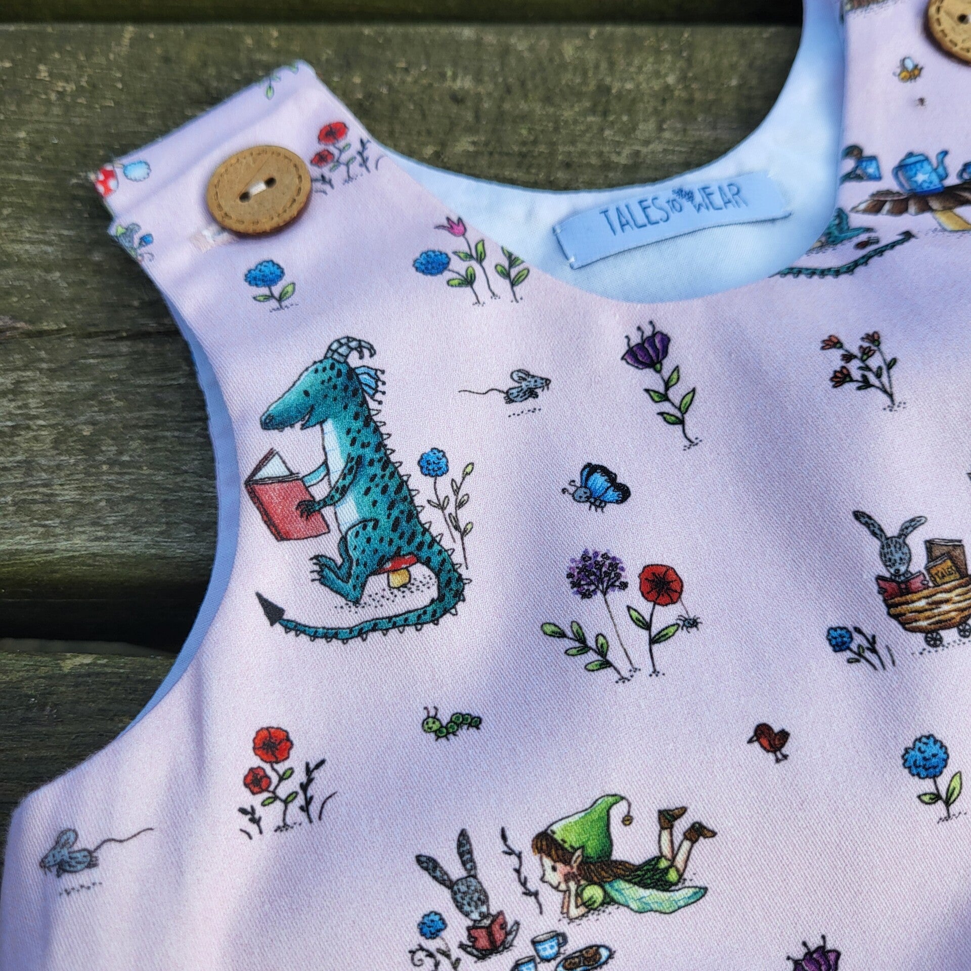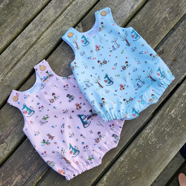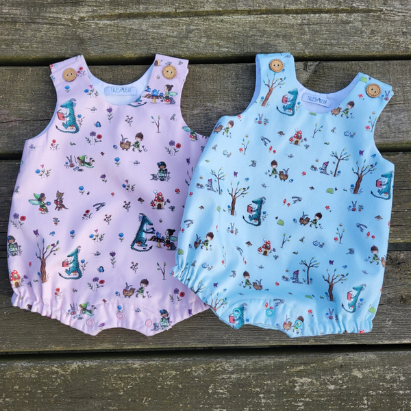 Handmade light blue Spring/ Summer romper in woven cotton, with open crotch, featuring the main theme from the Magical Tea Time collection.