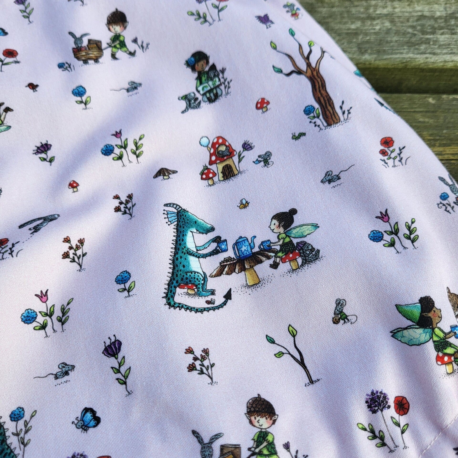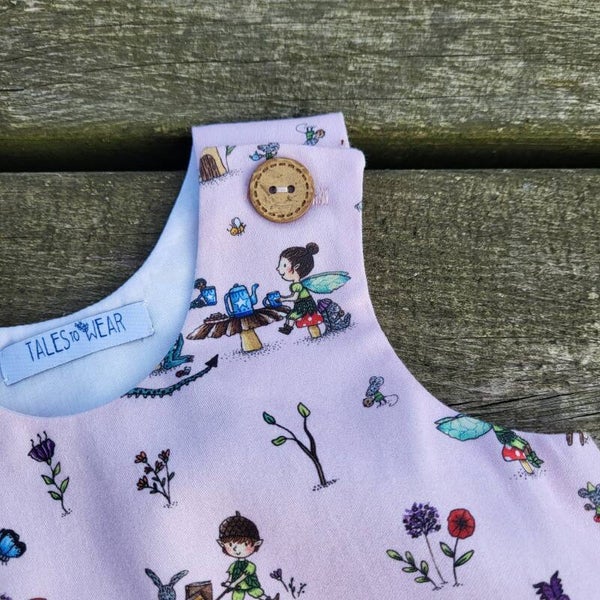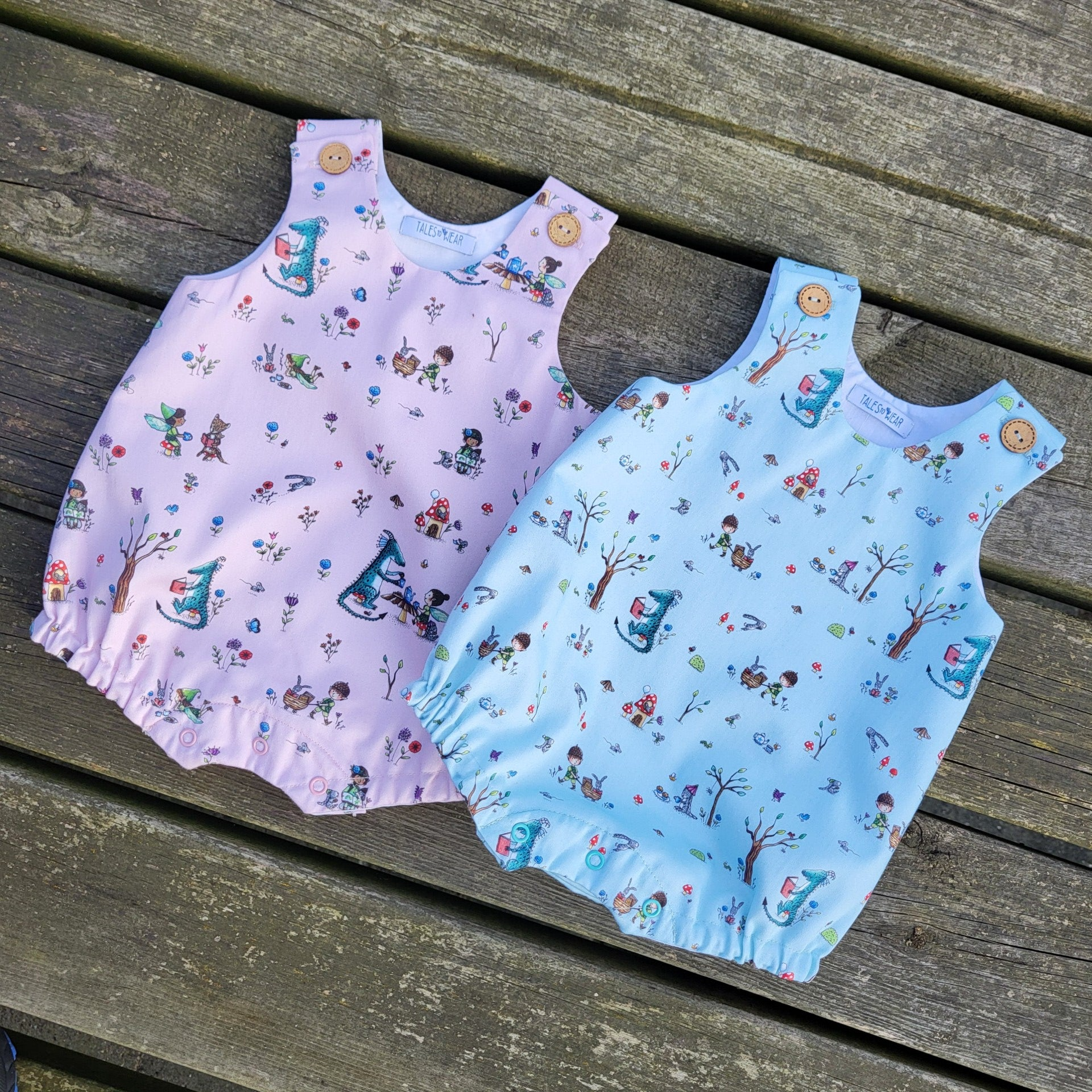 Handmade light blue Spring/ Summer romper in woven cotton, with open crotch, featuring the main theme from the Magical Tea Time collection.