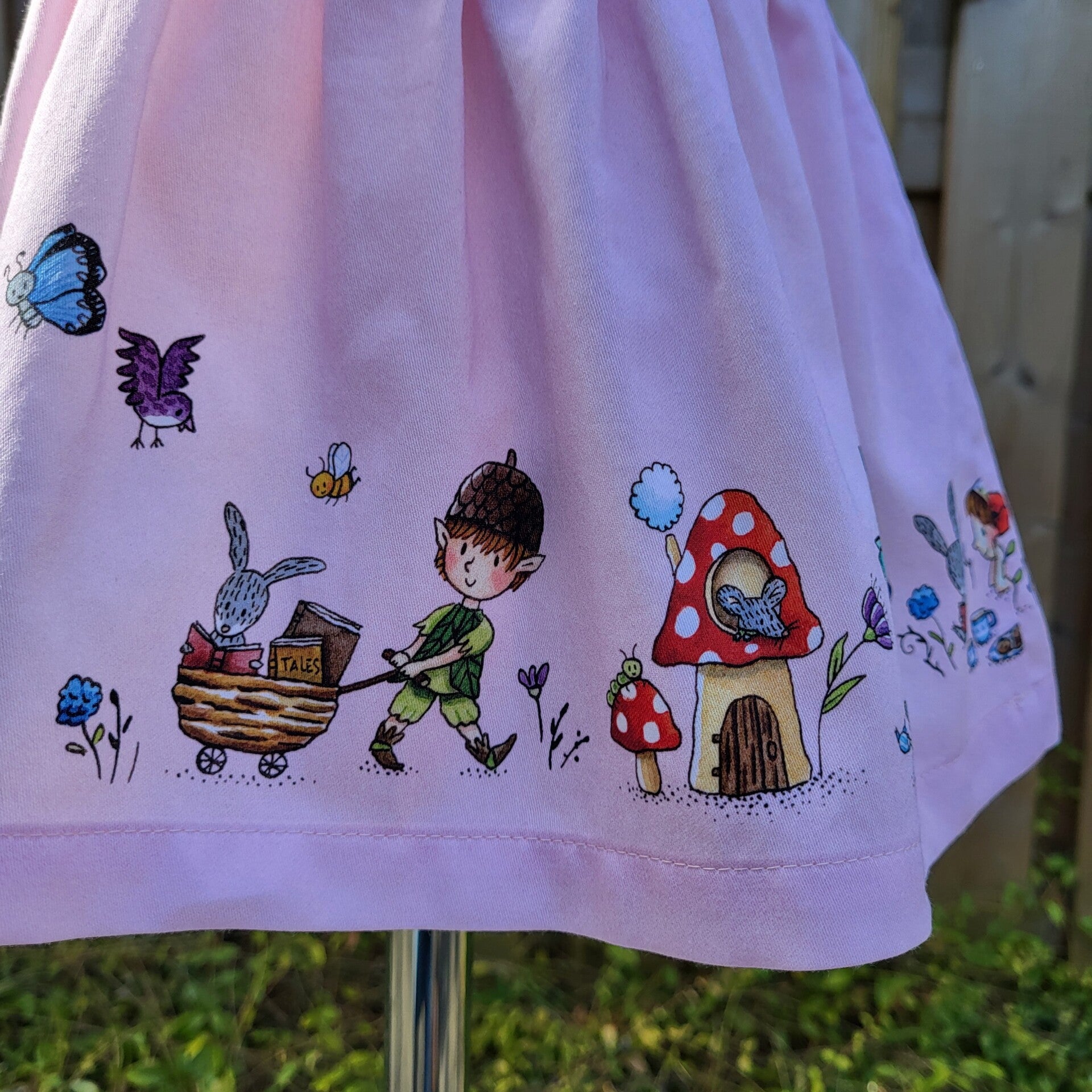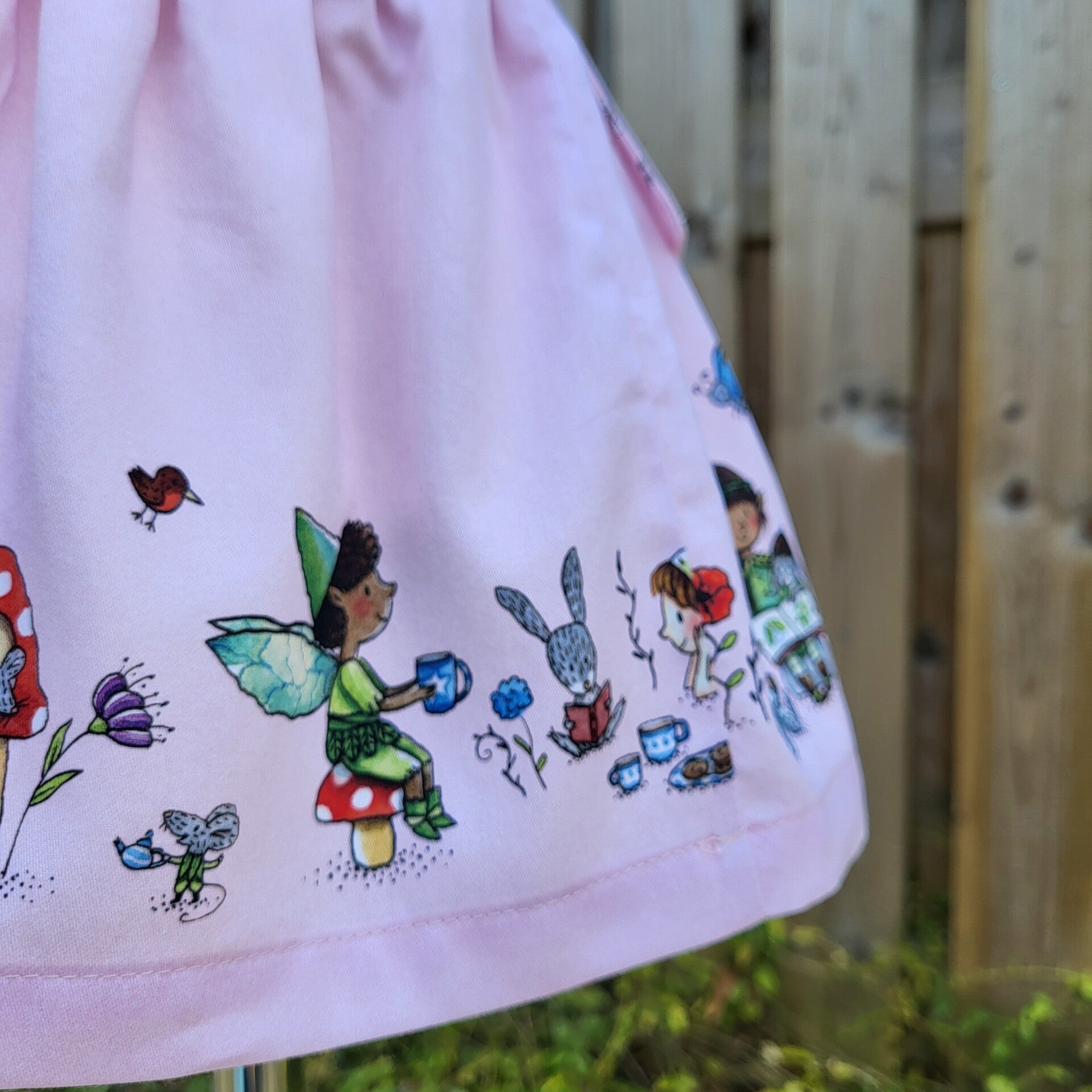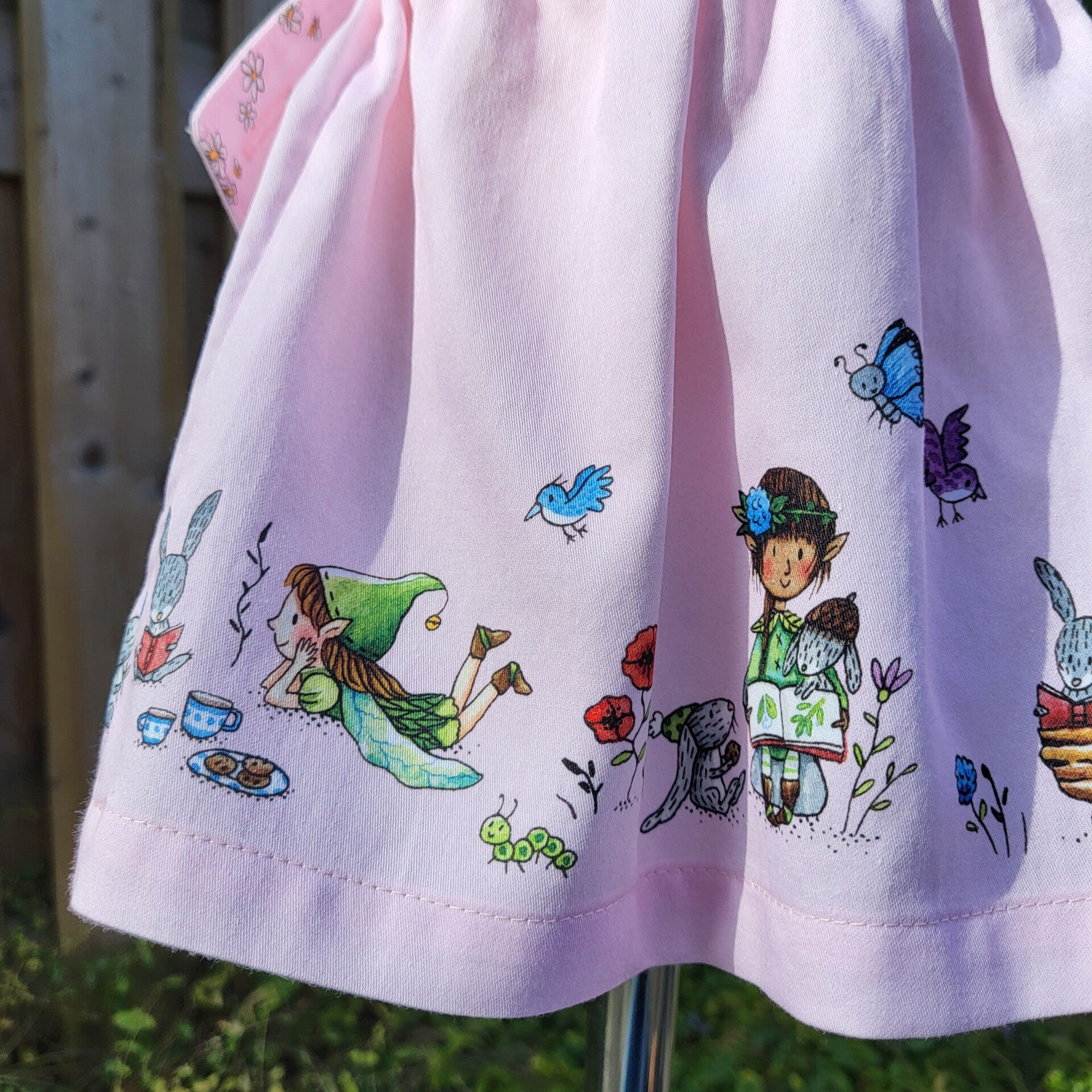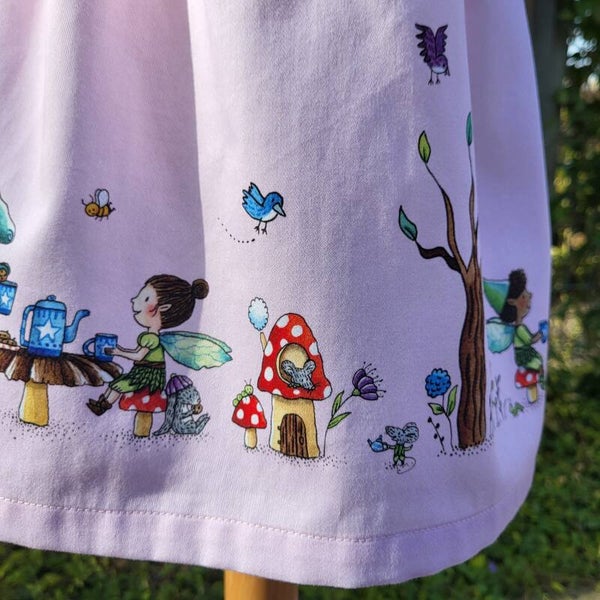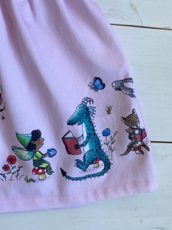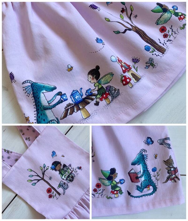 VIEW B (size 18-24 months) The illustration on the bib shows a cute fairy reading under a tree in company of her bunny friend. The gathered skirt features more cheerful characters such as our dragon friend reading to a very interested elf or chatting with another fairy during tea time.