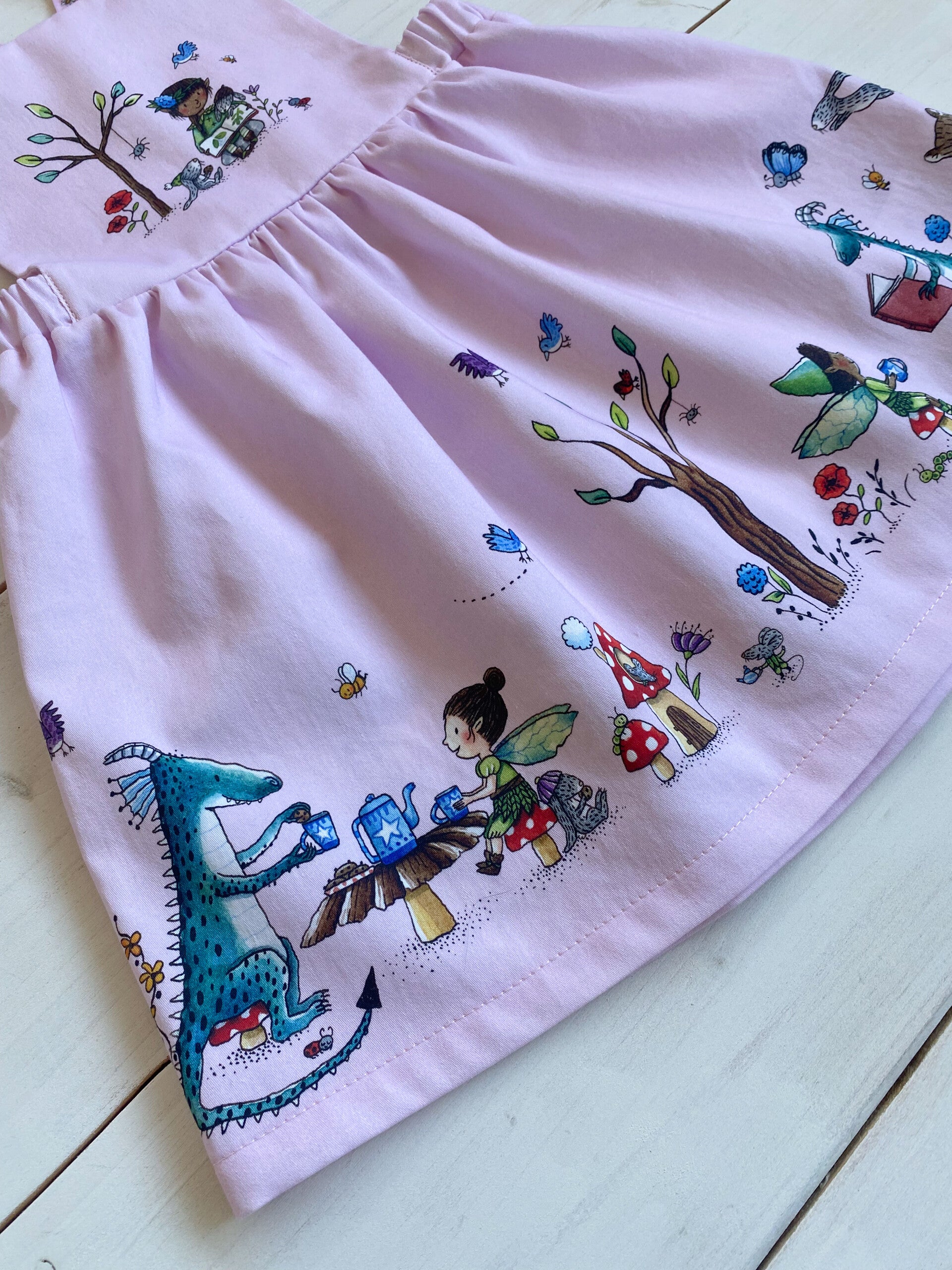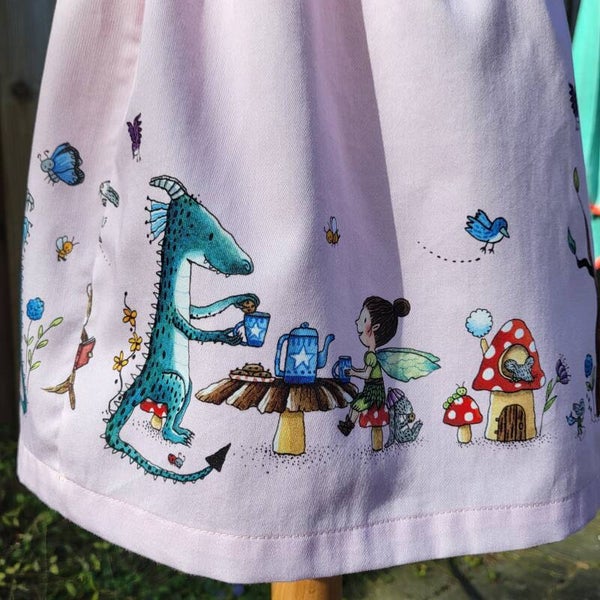 VIEW A (sizes 9-12 months and 12-18 months) If you are looking for size 9-12 months or 12-18 months - referred to as VIEW A - the exclusive front bib illustration shows a cute fairy laying on her belly. She's listening to her bunny friend's story. All around her cookies, muffins cake and tea. It really is teatime in the woods! At the bottom of the gathered skirt you will find more unique fairies, mice, a little elf, more bunnies and adorable mushrooms. Wouldn't you want to live in that cute mushroom house? I most definitely would! Please note that the skirt of VIEW A doesn't feature the dragon.