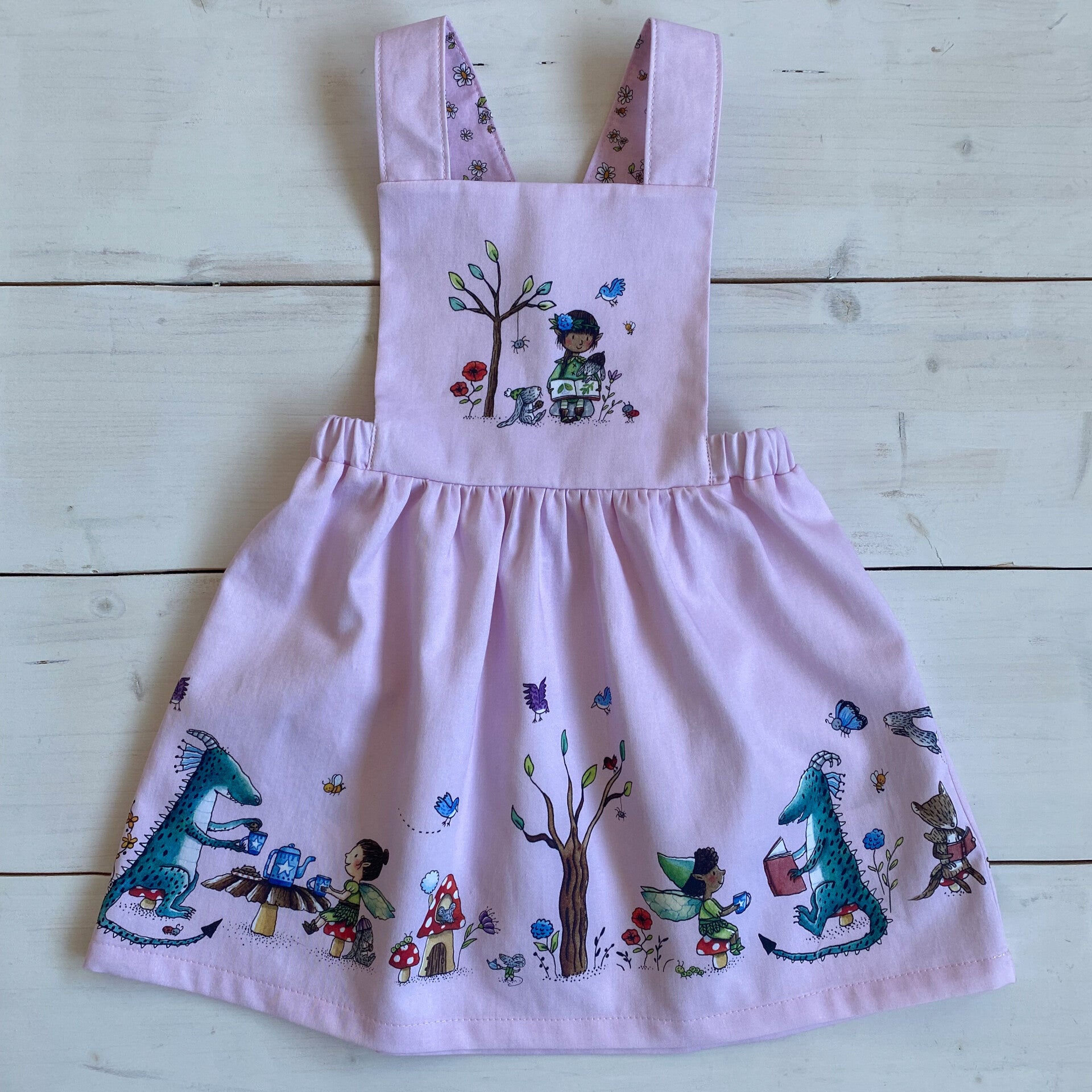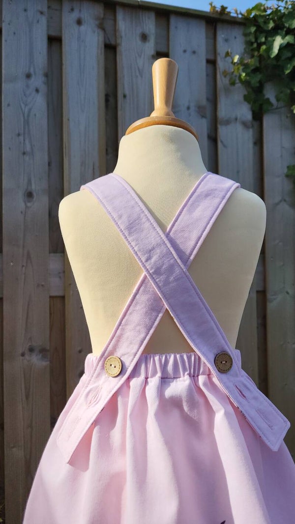 The adorable handmade POLLY pinafore dress with crossed back shoulder straps is made from 100% medium weight woven cotton and comes in pink. This pinny features exclusive illustrations on the front bib and skirt, which differ depending on the size you choose. All these lovely charaters were created and designed by the talented Rosalinde Bonnet, children's books illustrator, and you will only find in the garments of my shop!
