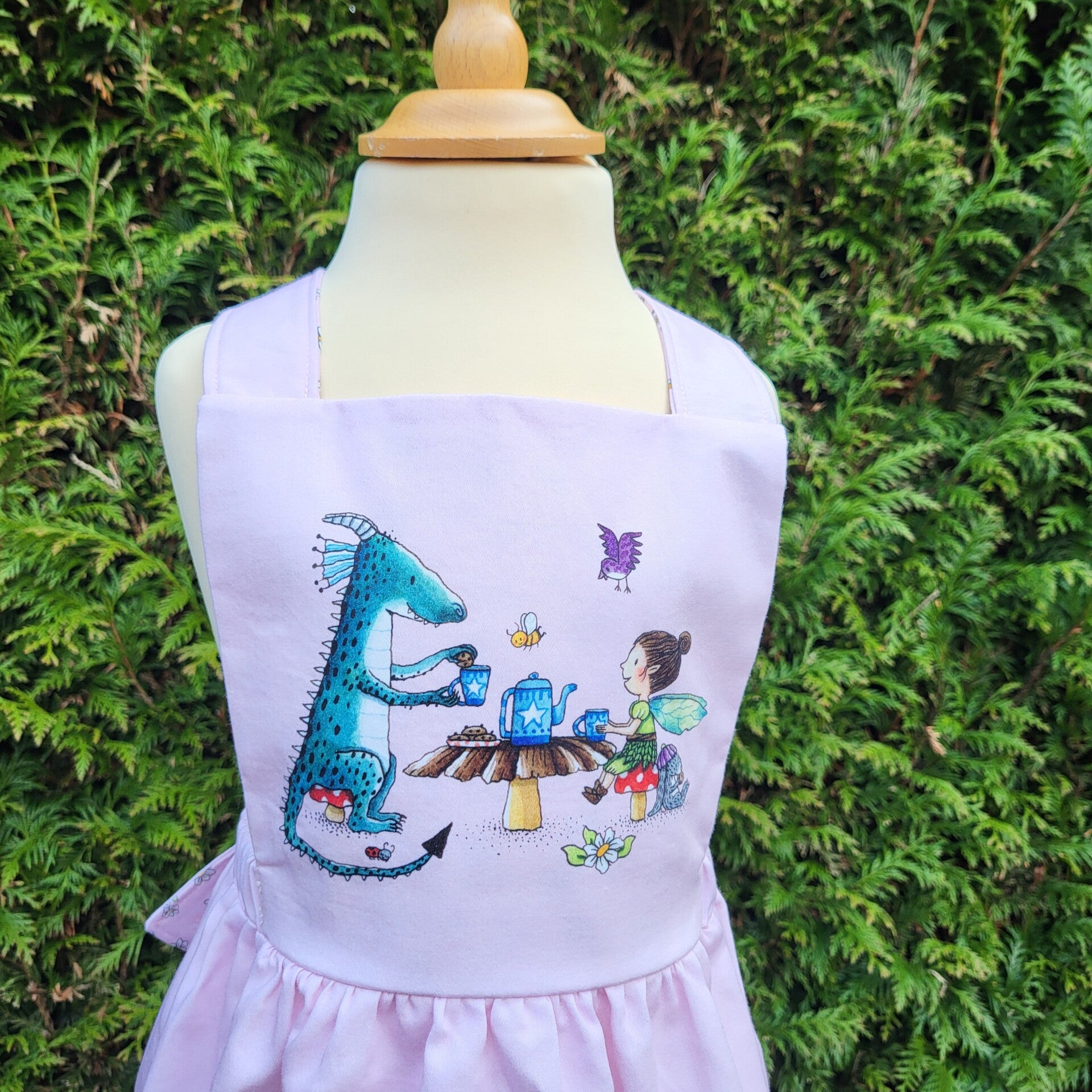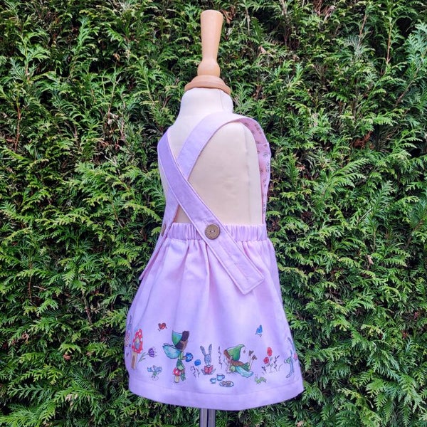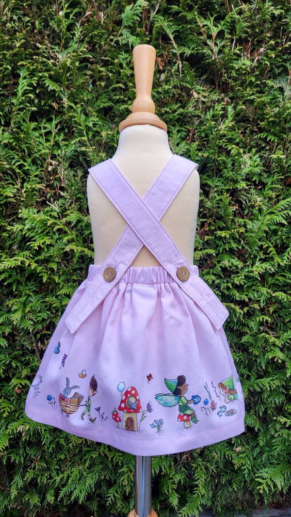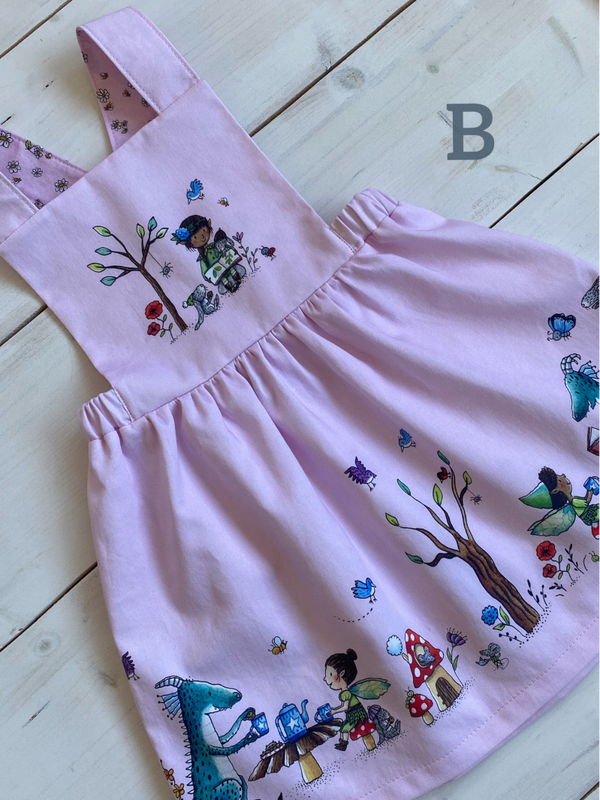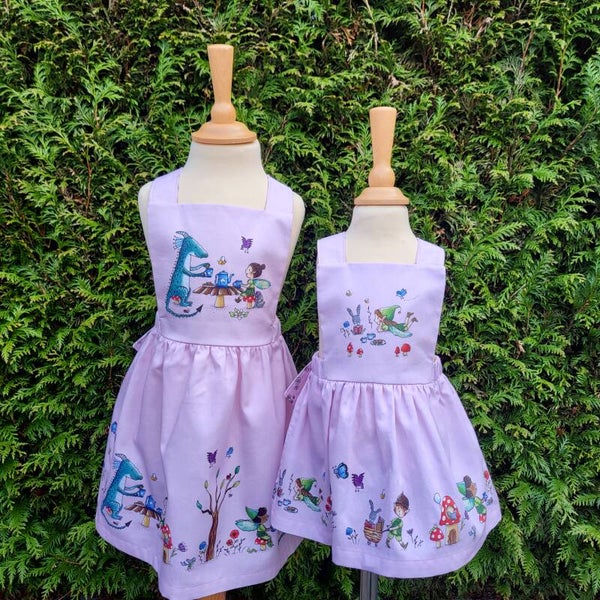 - Please Note: Sizes 9-12 and 12-18 months (referred to as VIEW A) come with a different fairy characters on the front bib and skirt than sizes 18-24 months (VIEW B) and 3 years and 4 years (VIEW C). The skirt of VIEW B and C features dragons, the skirt of VIEW A does not. It features fairies and elves instead! BUT because these are the very last sizes I made, I have had some fun with the combinations. Therefore the smaller sizes may have a different fairy portrayed on the bib (the skirts are the same though). If you are picky about the fairy on the bib, get in touch first ;-)
