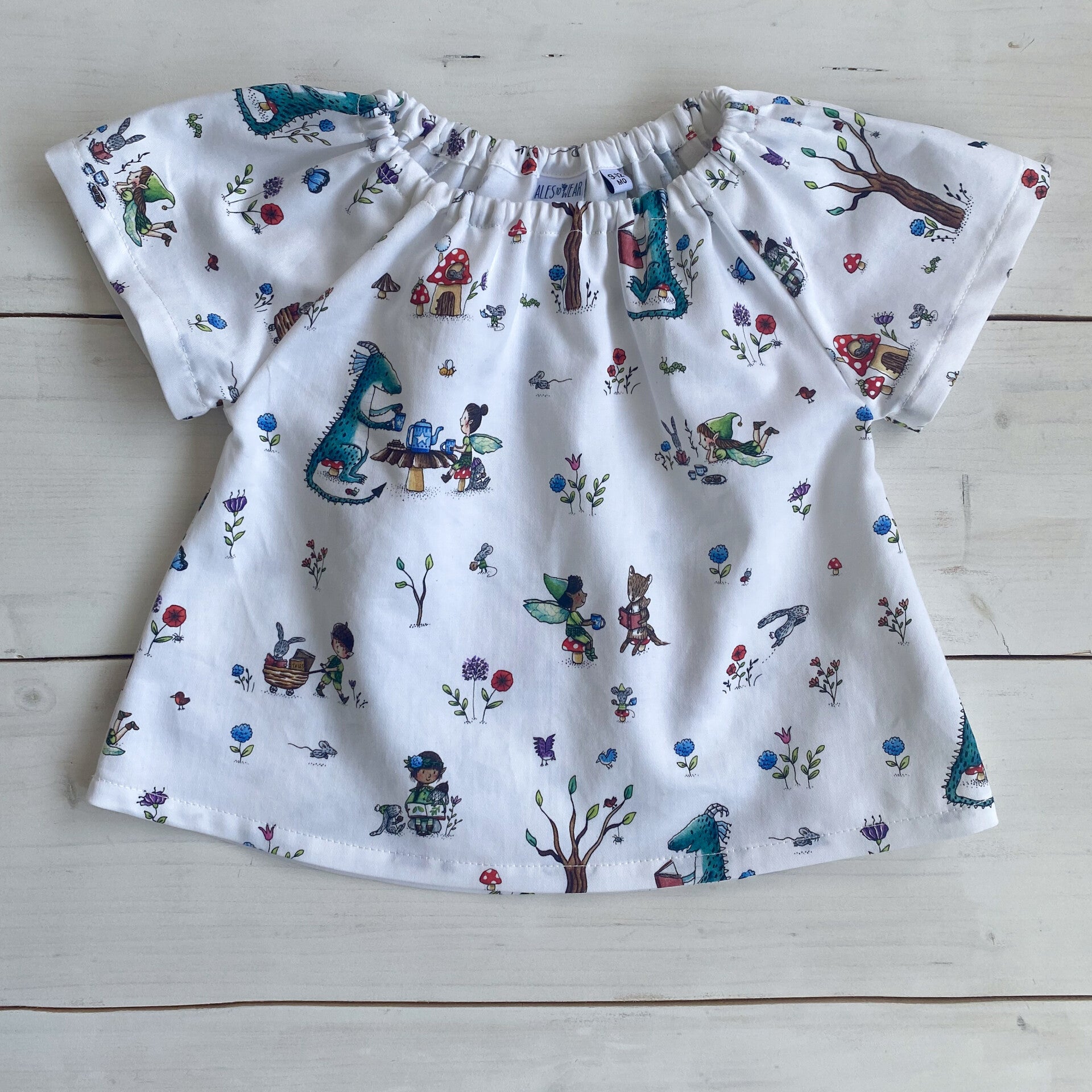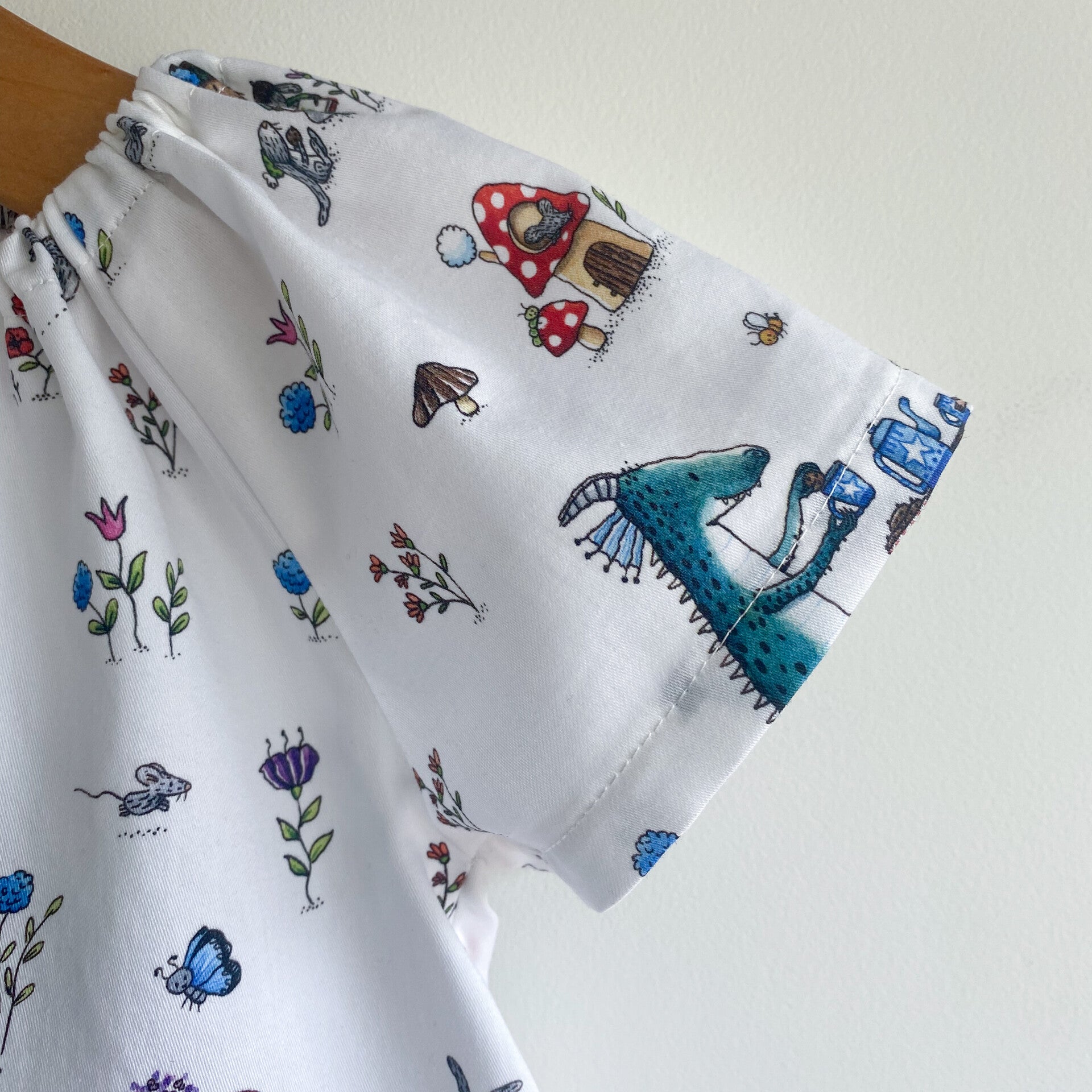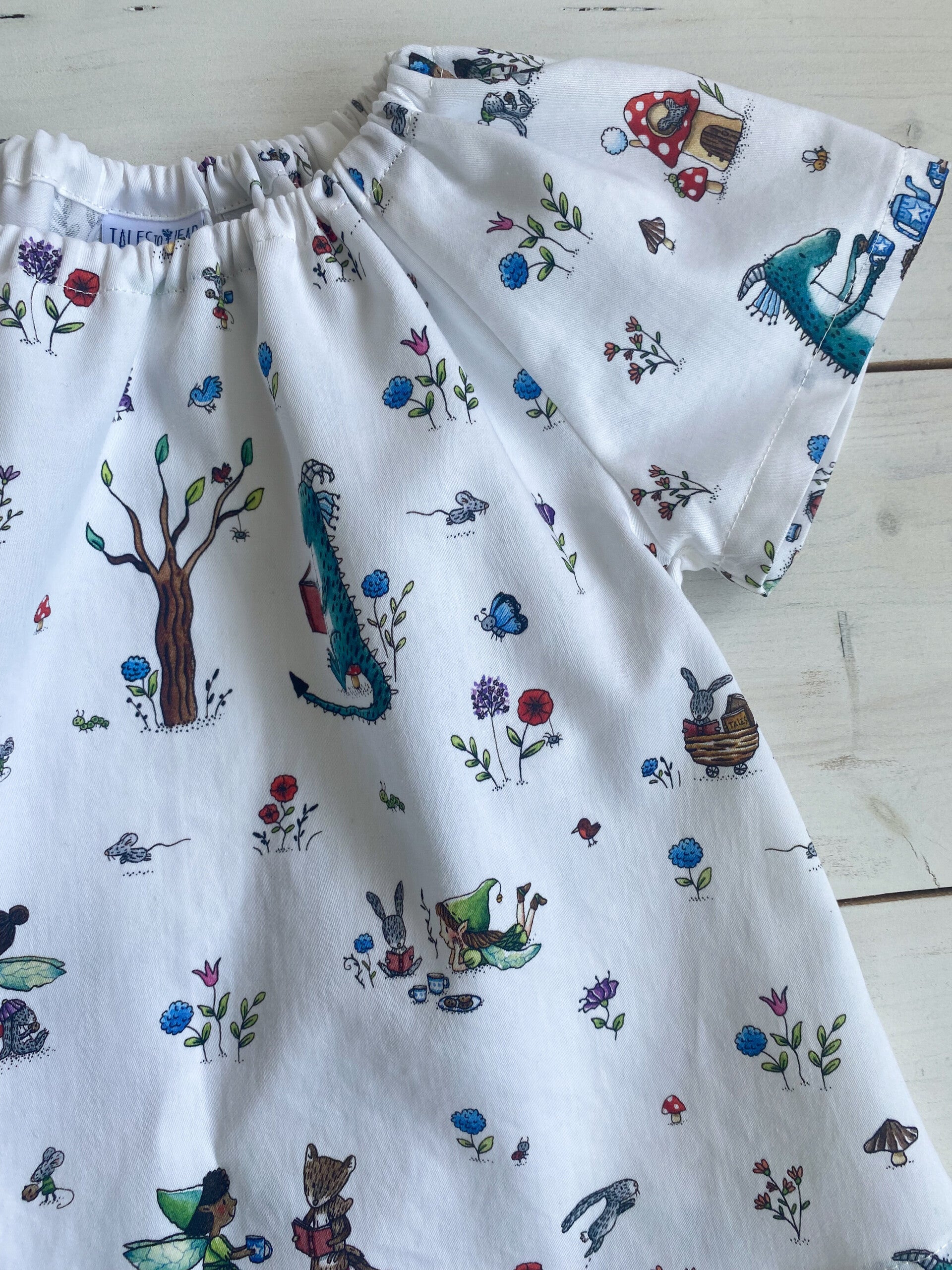 Handmade white shirt made from woven cotton with elastic on the neckline which makes it easy to put it on and off, featuring the main characters from the Magical Tea Time collection.