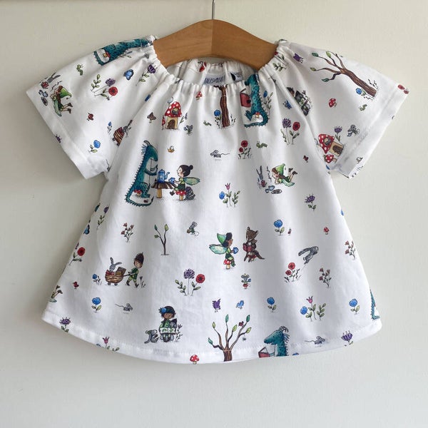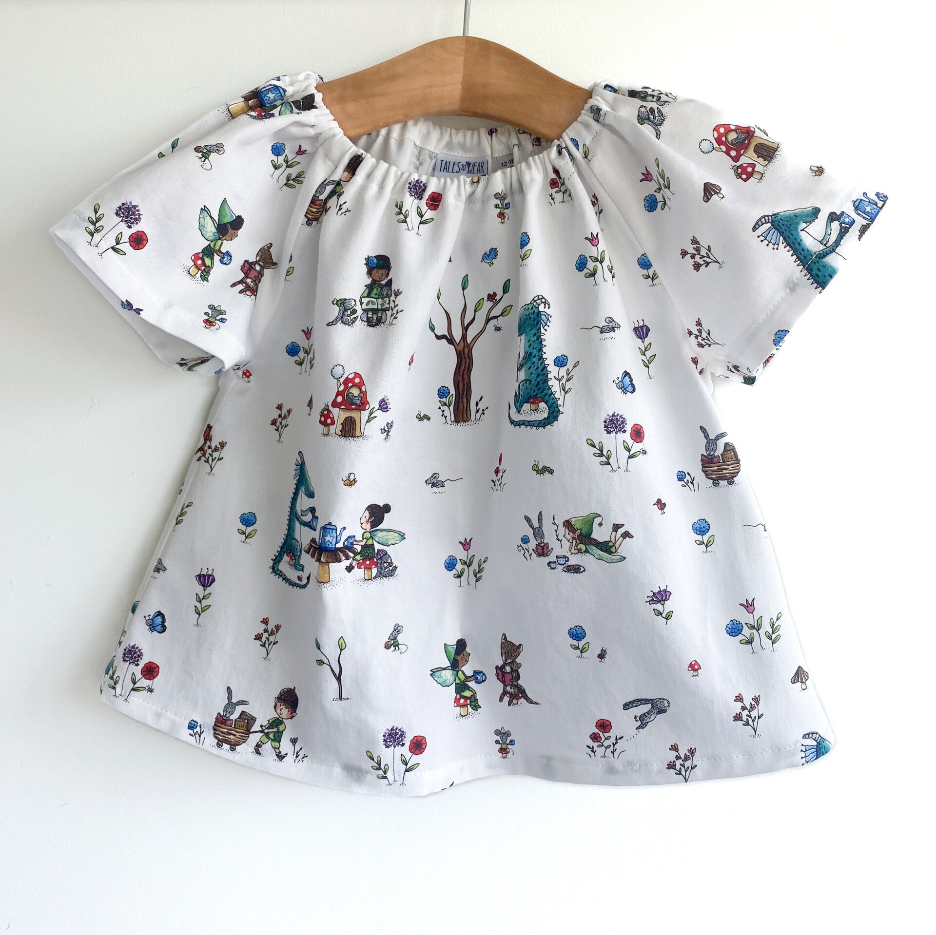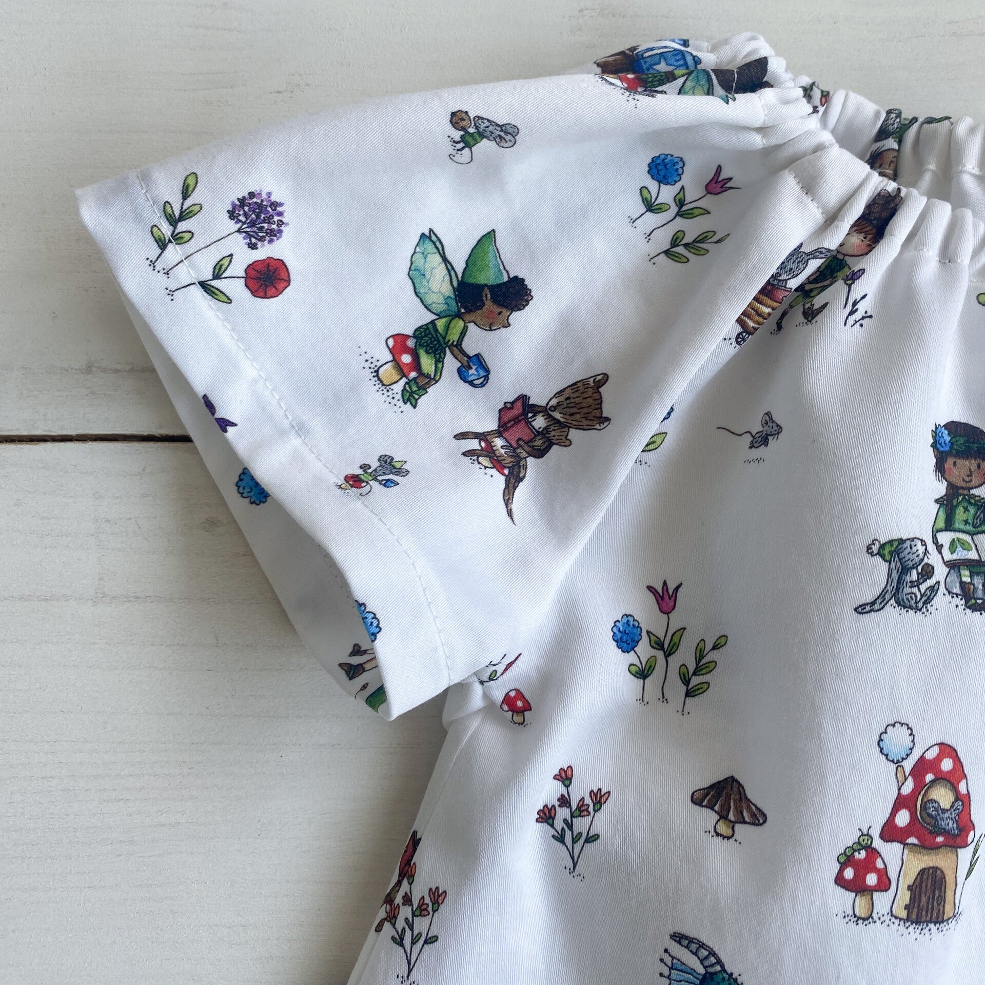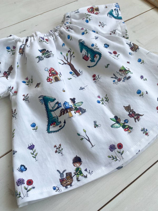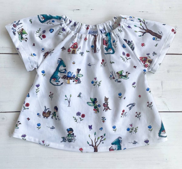 Handmade white shirt made from woven cotton with elastic on the neckline which makes it easy to put it on and off, featuring the main characters from the Magical Tea Time collection.