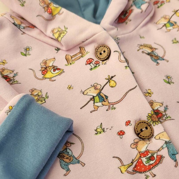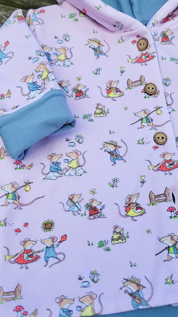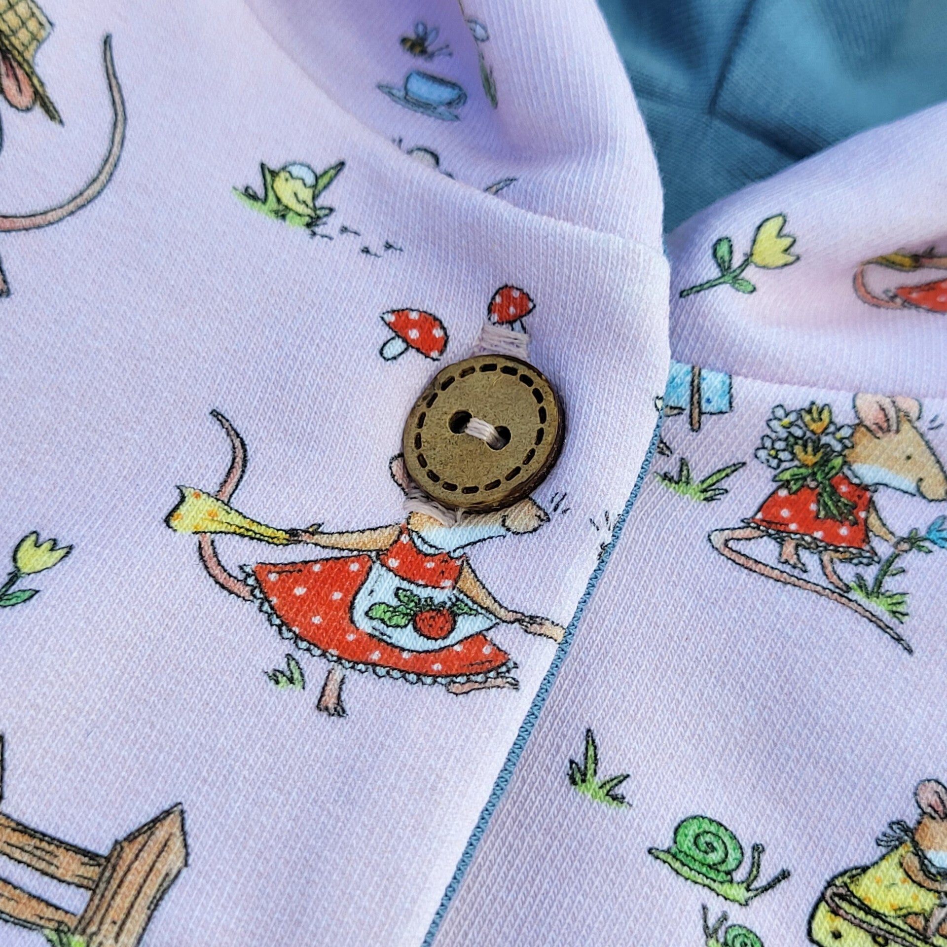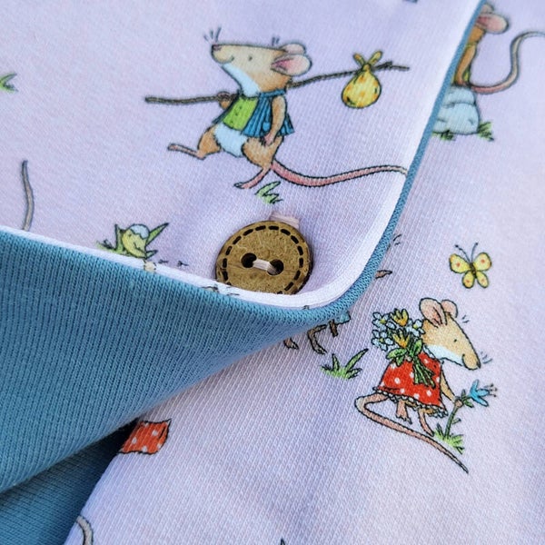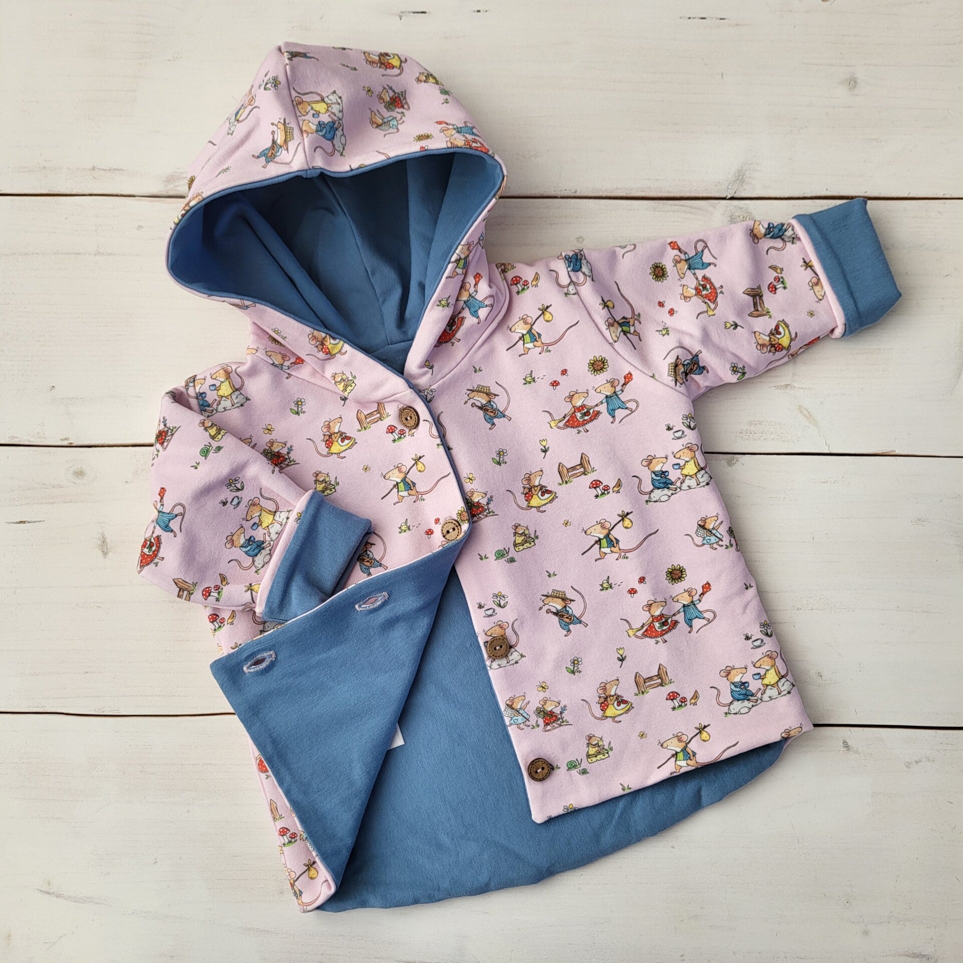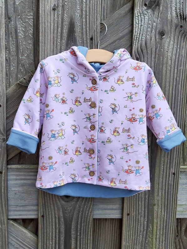 Handmade baby/children pink jacket from organic cotton jersey featuring the mice from The Country Mouse and The City Mouse collection.