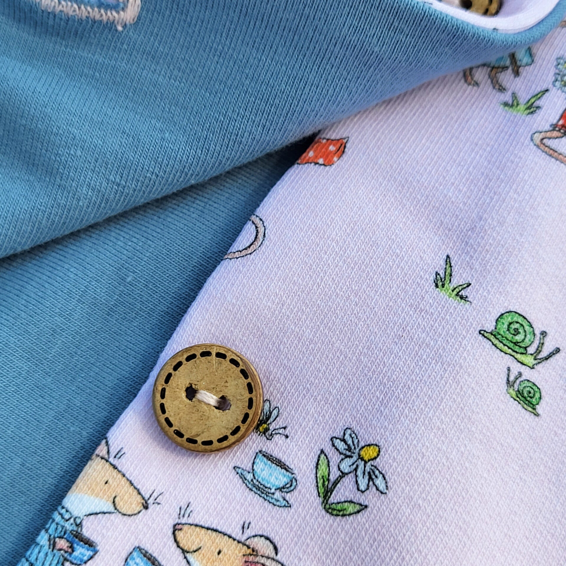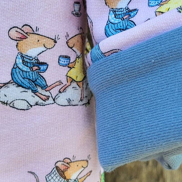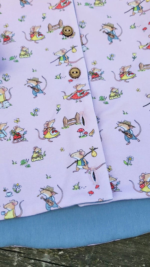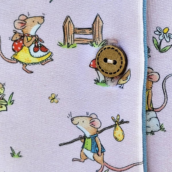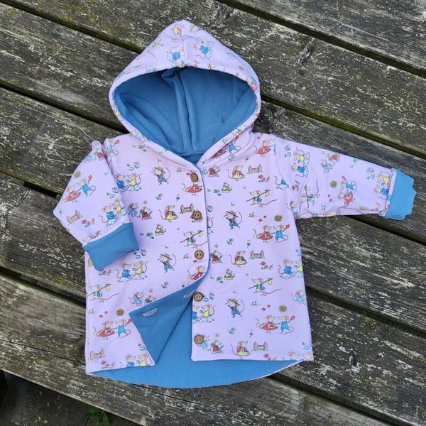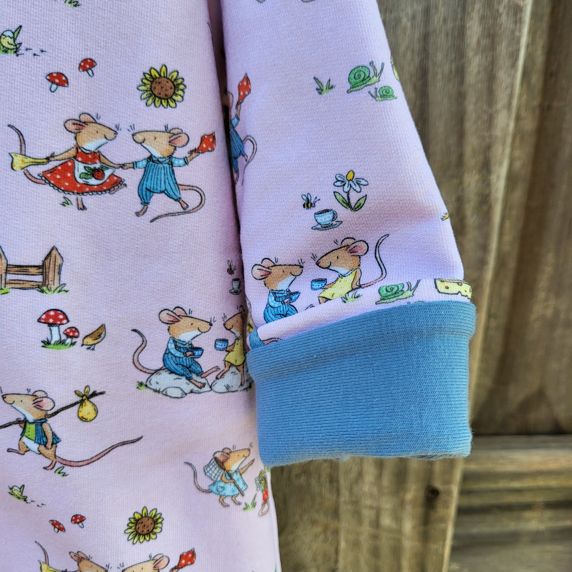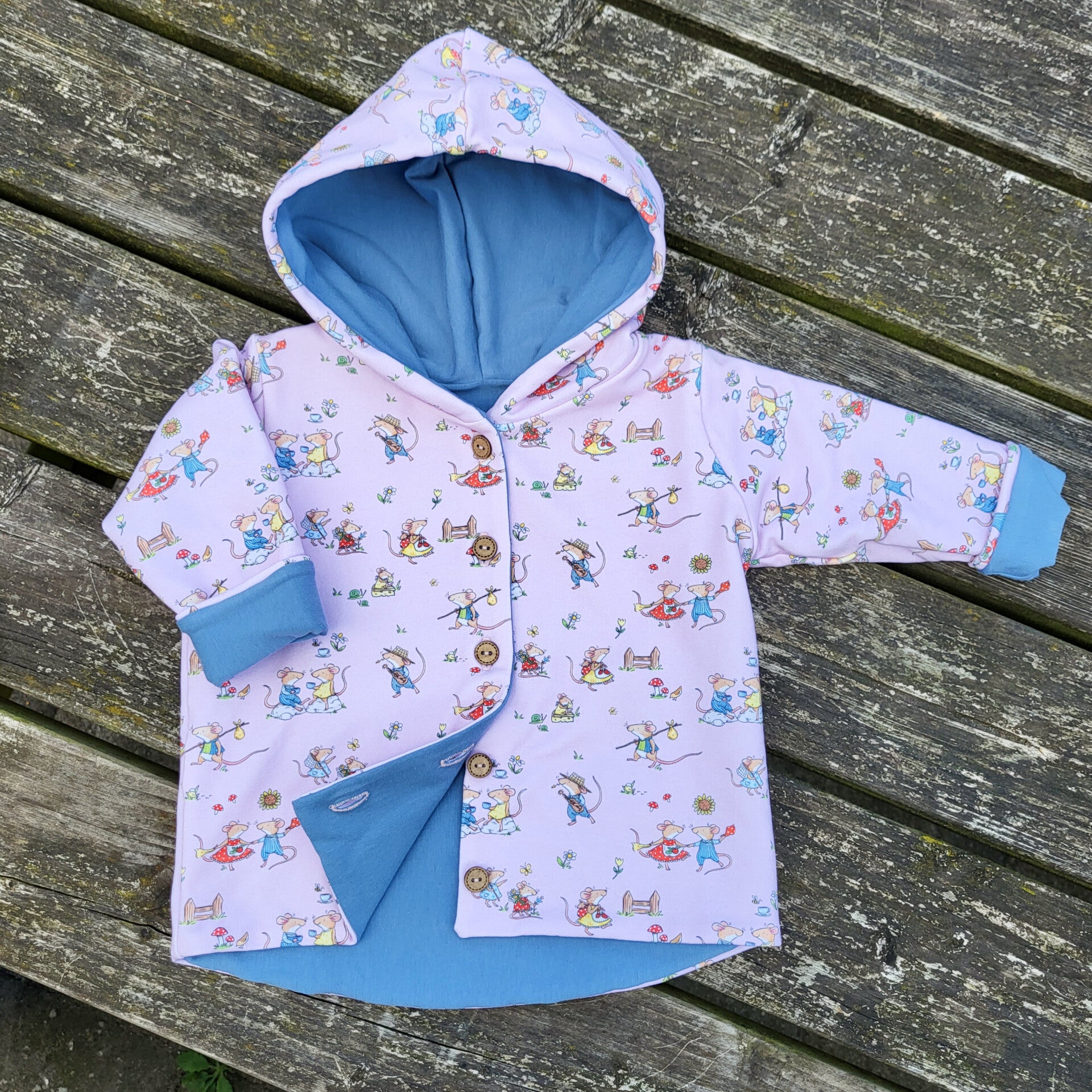 Handmade baby/children pink jacket from organic cotton jersey featuring the mice from The Country Mouse and The City Mouse collection.
