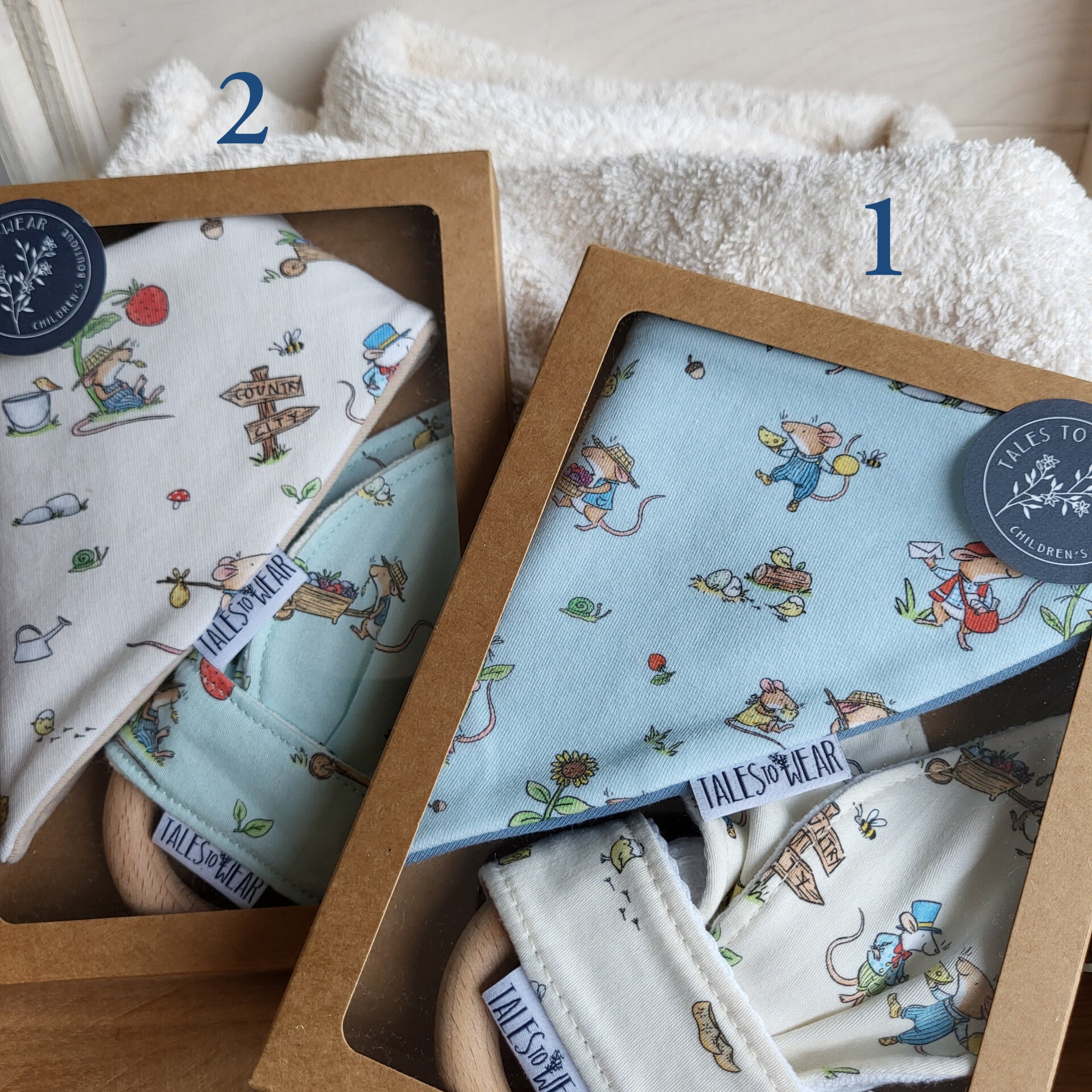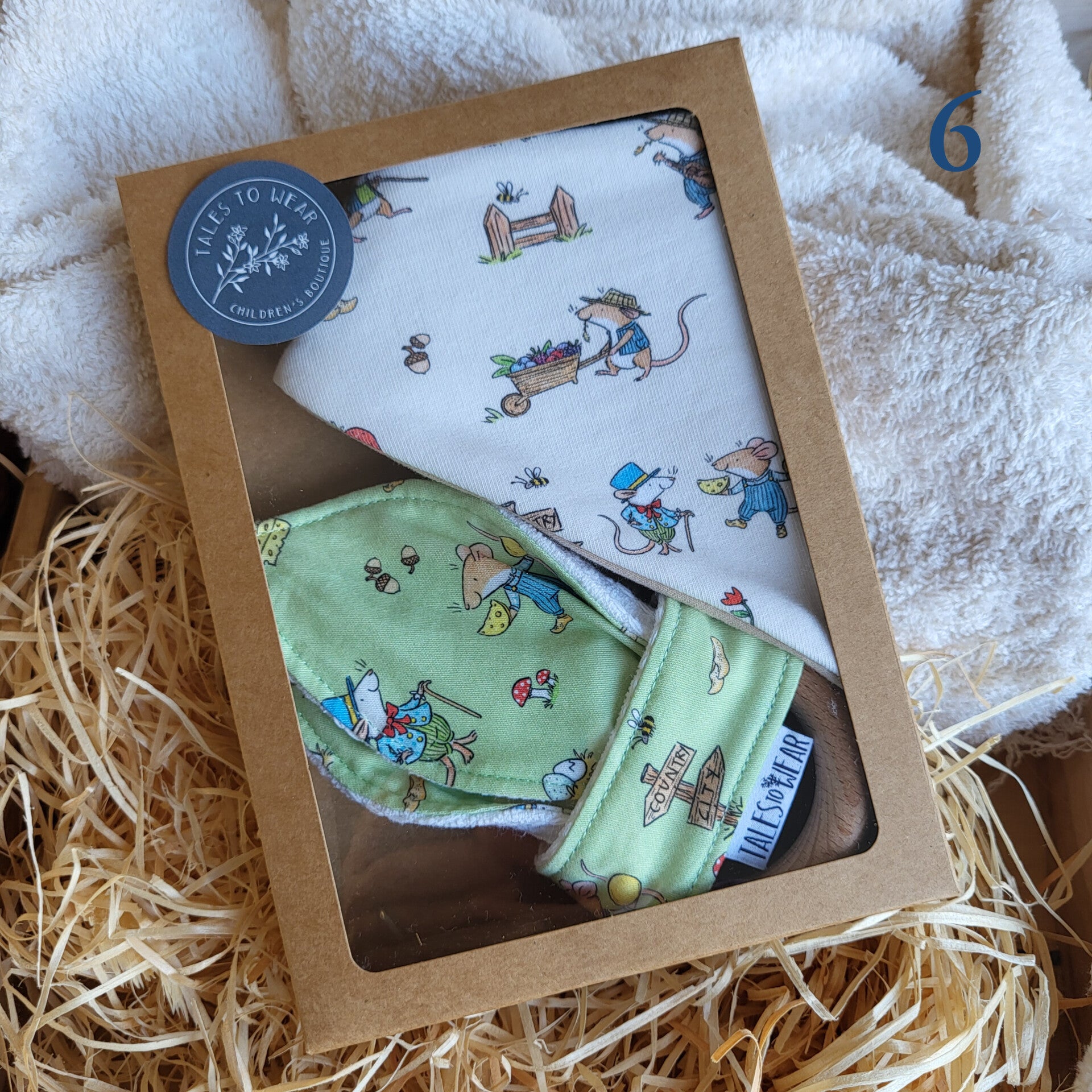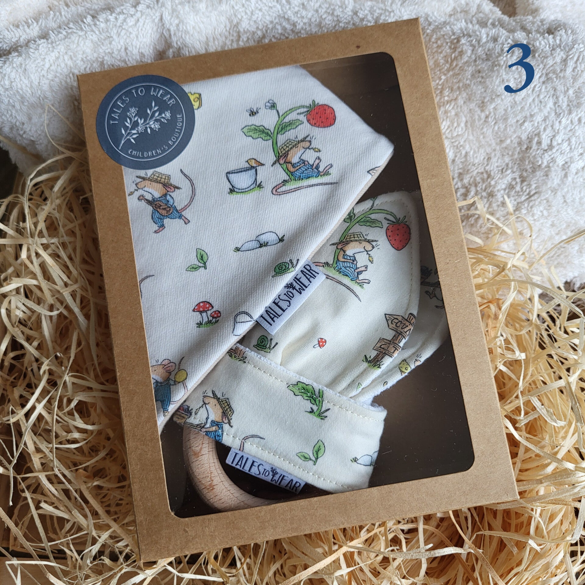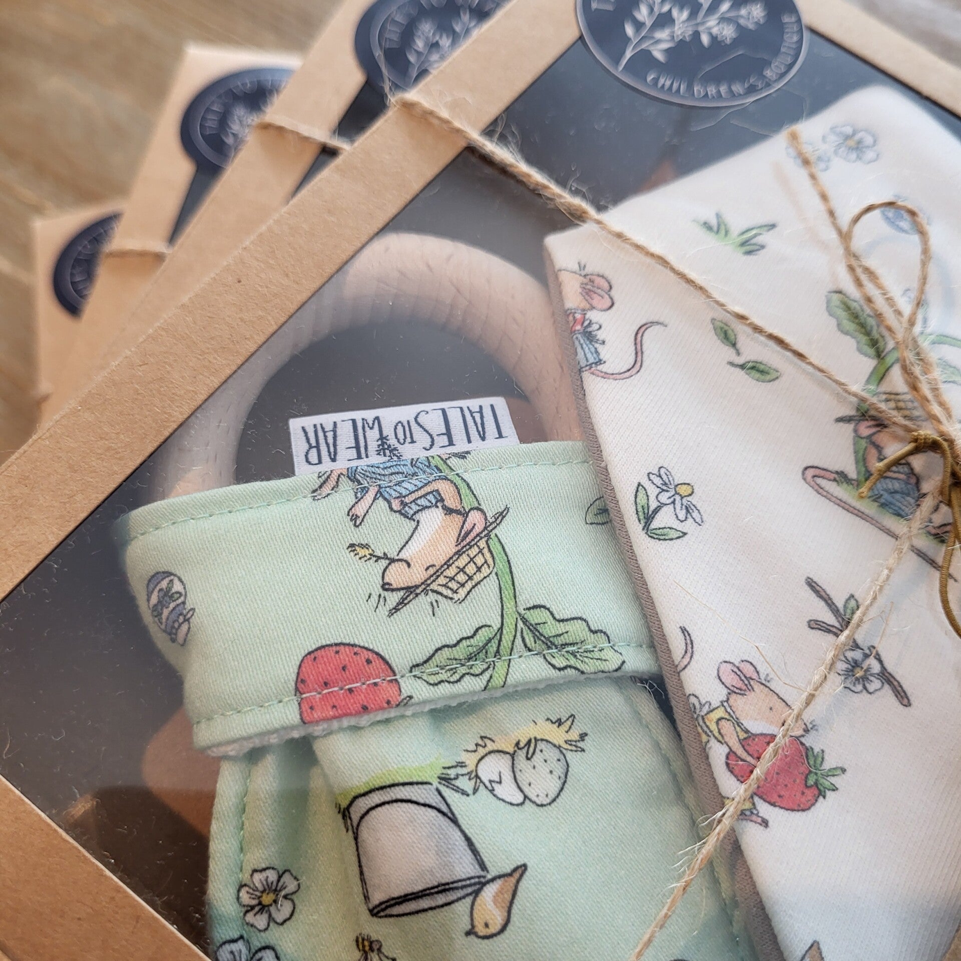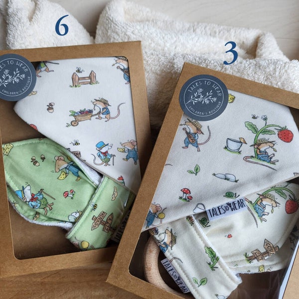 GIFTBOX containing 1 teether + 1 bandana drool bib (0-12 months) from The Country Mouse and The City Mouse collection.