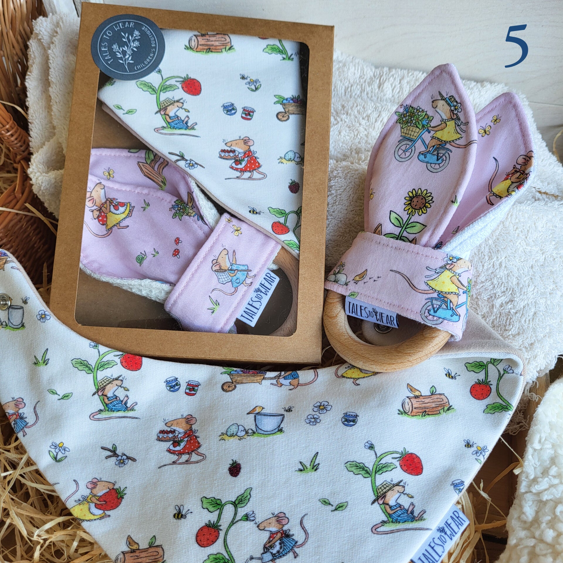 - PINK bandana bib/ "Bike + mom & baby" pattern + NATURAL "City Mouse" teether.