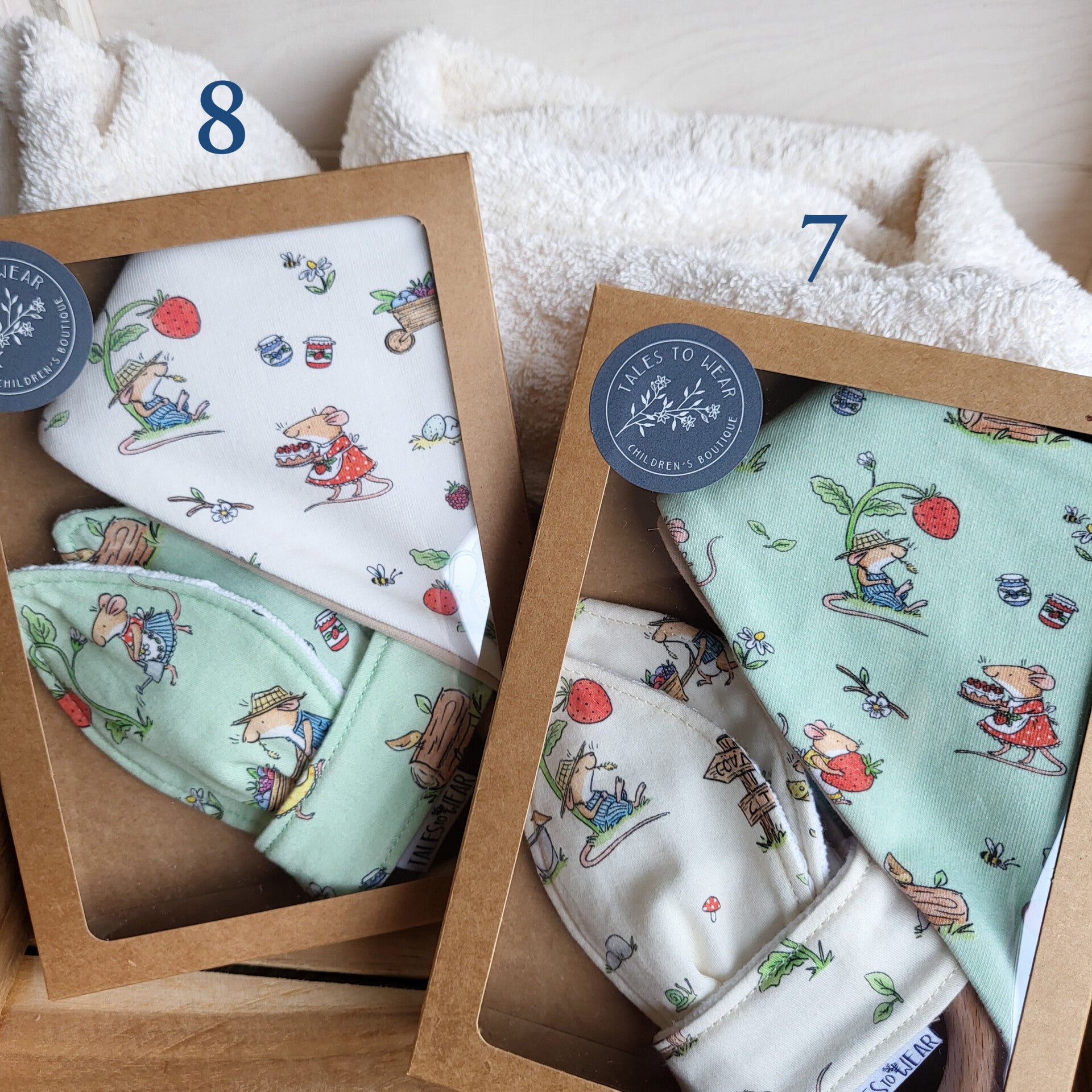 - BLUE bandana bib/ "Chores" pattern + NATURAL teether/ "City Mouse" pattern.
